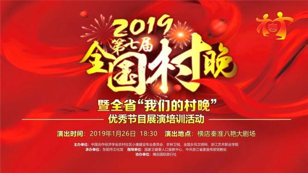 2019年1月26日,第七届全国村晚暨浙江村晚优秀节目展在东阳举办,来自全国乡村的经过层层筛选26个节目精彩上演。村晚分“南腔北调”“歌舞西东”“小村大爱”三个篇章,以“金猪闹春”开场,“阳光家园”收尾,从地域、形式、体验等方面,盘点了中国乡村的喜庆场面,展现了新时代农村生产生活的新气象、新风貌,表达了农民群众对美好生活的热爱和向往。全国村晚受到主流媒体的广泛关注,人民日报、新华社、爱奇艺、腾讯等20多家视频直播平台进行了现场直播,仅浙广直播的就有近30万观众点击收看。村晚录制好的节目通过相关卫视、全国村晚有线电视播出联盟、网络视频,在春节期间播出。