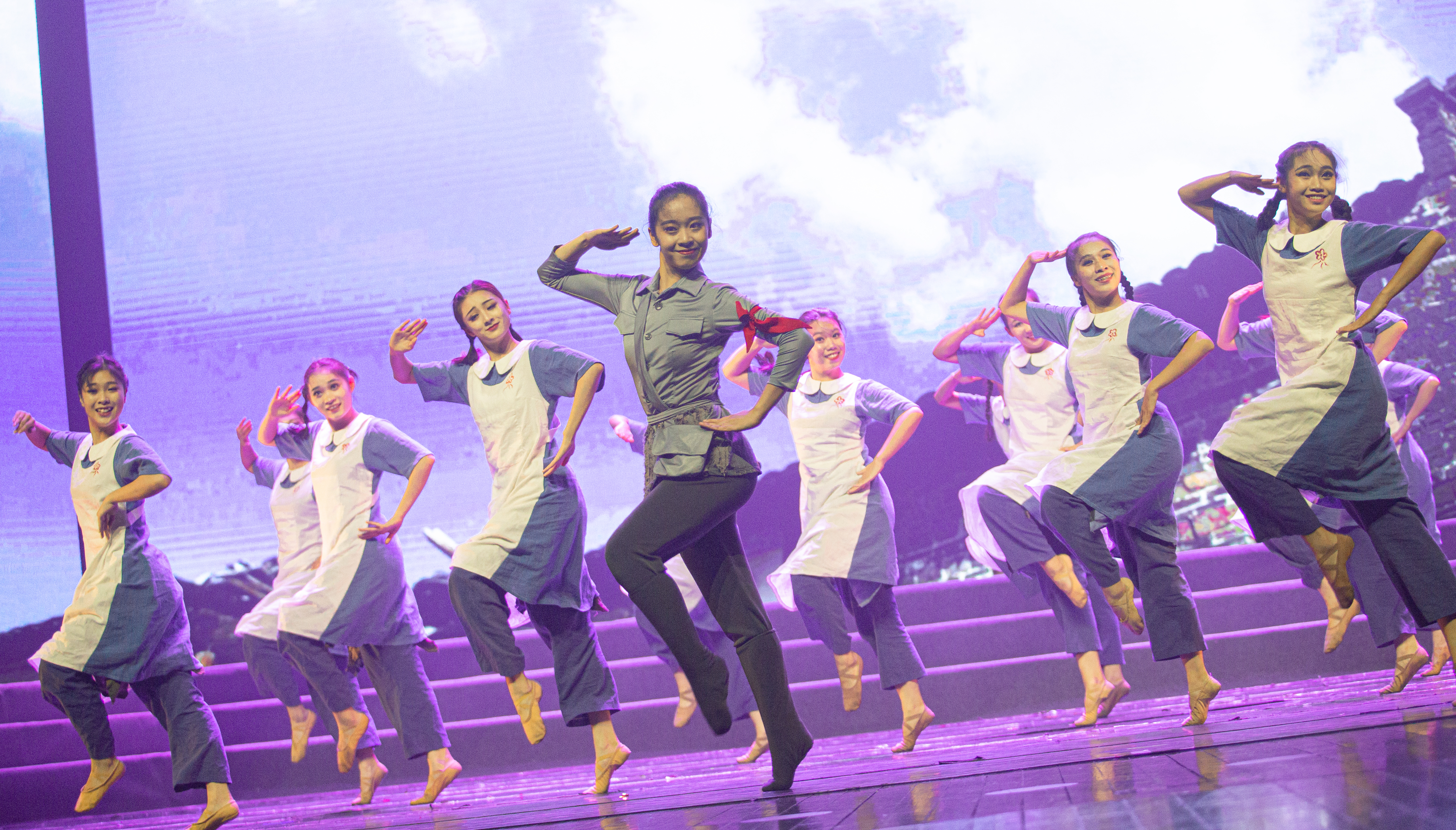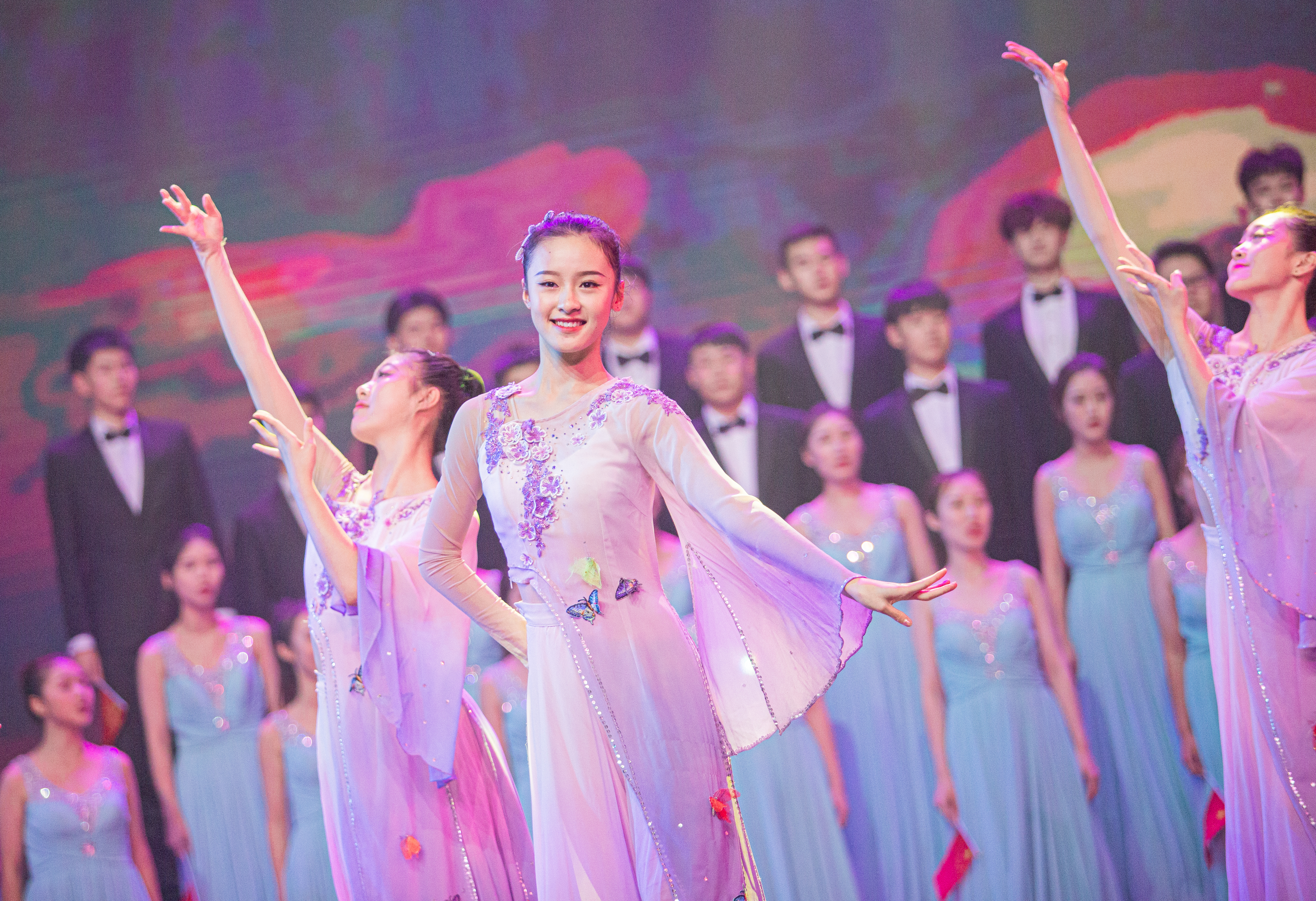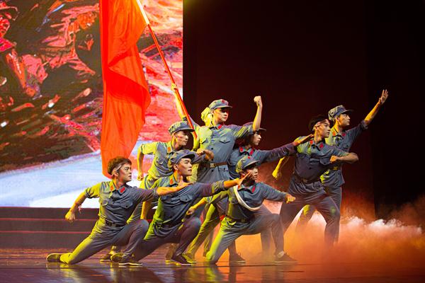 2019级新生、小百花班学生陈可心挥舞着国旗首先出场,“我和我的祖国,一刻也不能分割”的旋律点燃了现场合唱的气氛。舞蹈系群舞《烽火摇篮》演绎了抗战时期,革命战士在炮火中奋勇抗战,为了革命信念、人民幸福壮烈牺牲的场景,催人泪下。戏剧系副主任周伟君演唱了越剧专业教师吕静策划的课程思政作品、越歌《七律·长征》,气势恢宏振奋人心,台下掌声雷动。音乐系女声小组唱《洪湖岸边是我家》,清新秀丽,柔美中又带着俏皮。戏剧系青年教师郑佳艳演唱京歌《卜算子·咏梅》,一亮嗓,台下就响起一片尖叫。观众纷纷拿起手机全程录像。原创音诗画《初心》中,戏剧影视表演专业五个班级130多人集体亮相,凝心聚力,再现了党的诞生、南昌起义、红军长征等历史瞬间。
