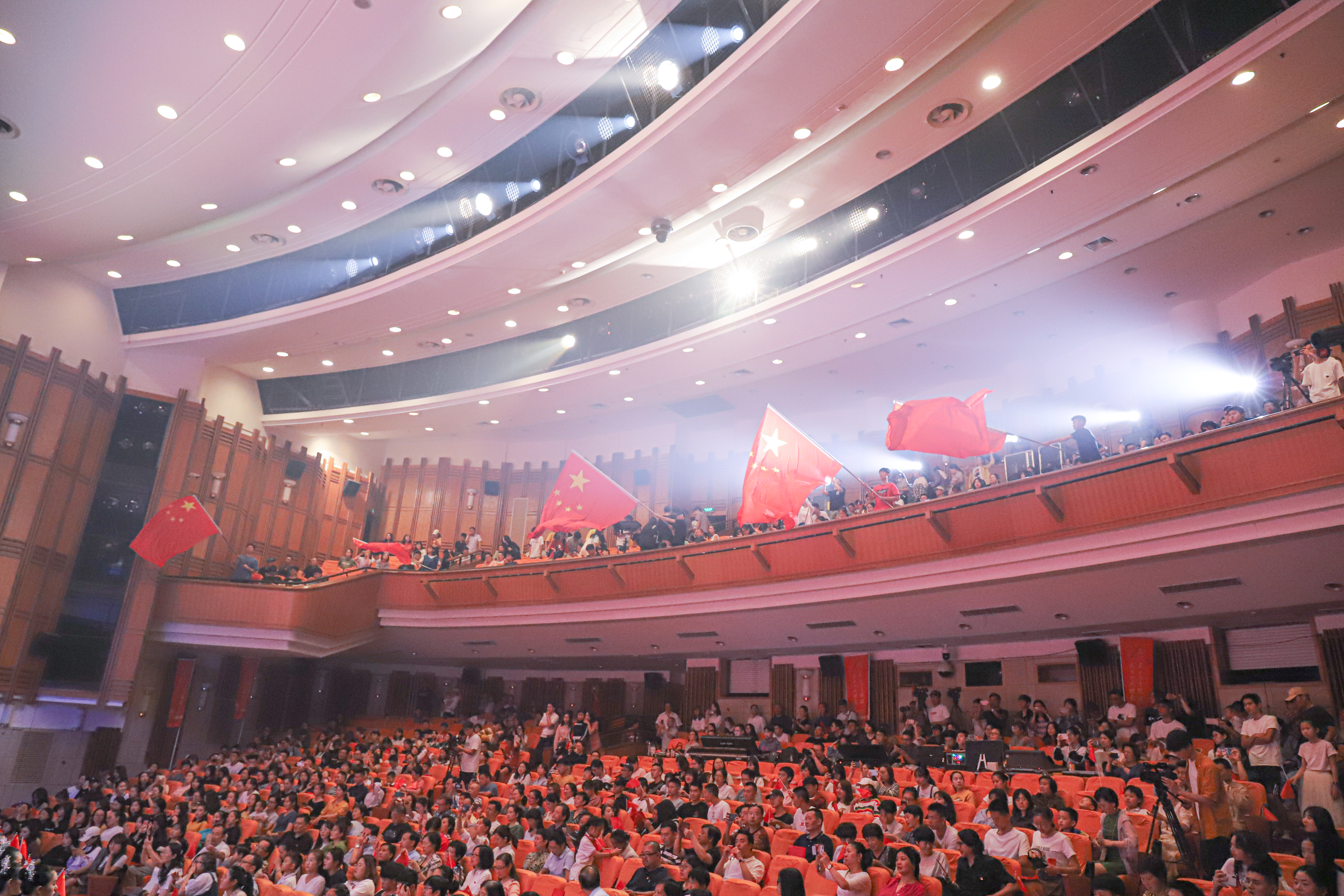 台上演员和观众全体合唱了《歌唱祖国》,国旗挥起来,歌声响彻剧场内外,共同祝祖国生日快乐,祝福祖国越来越好。