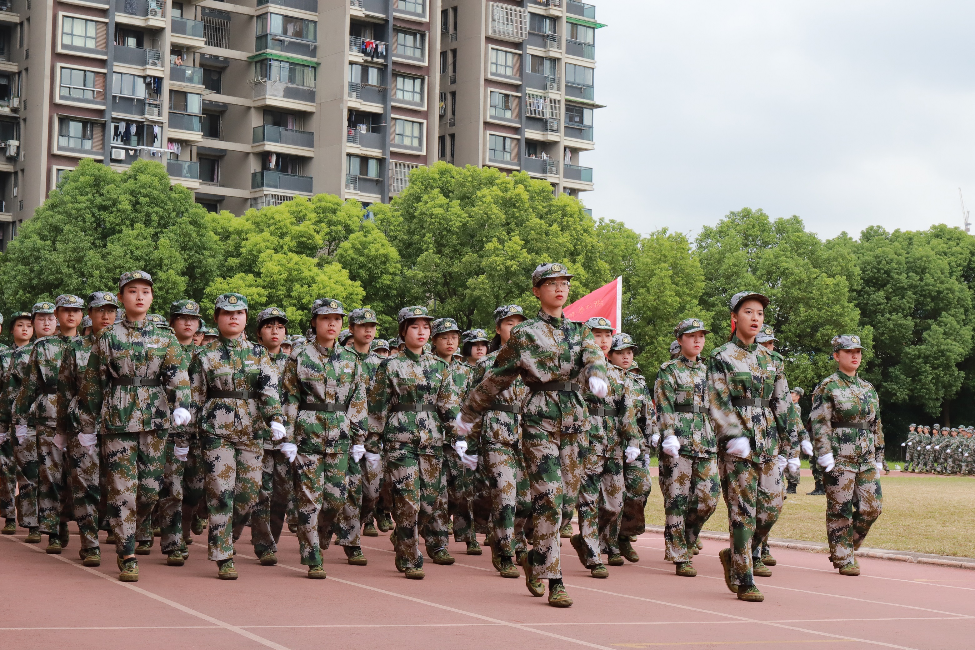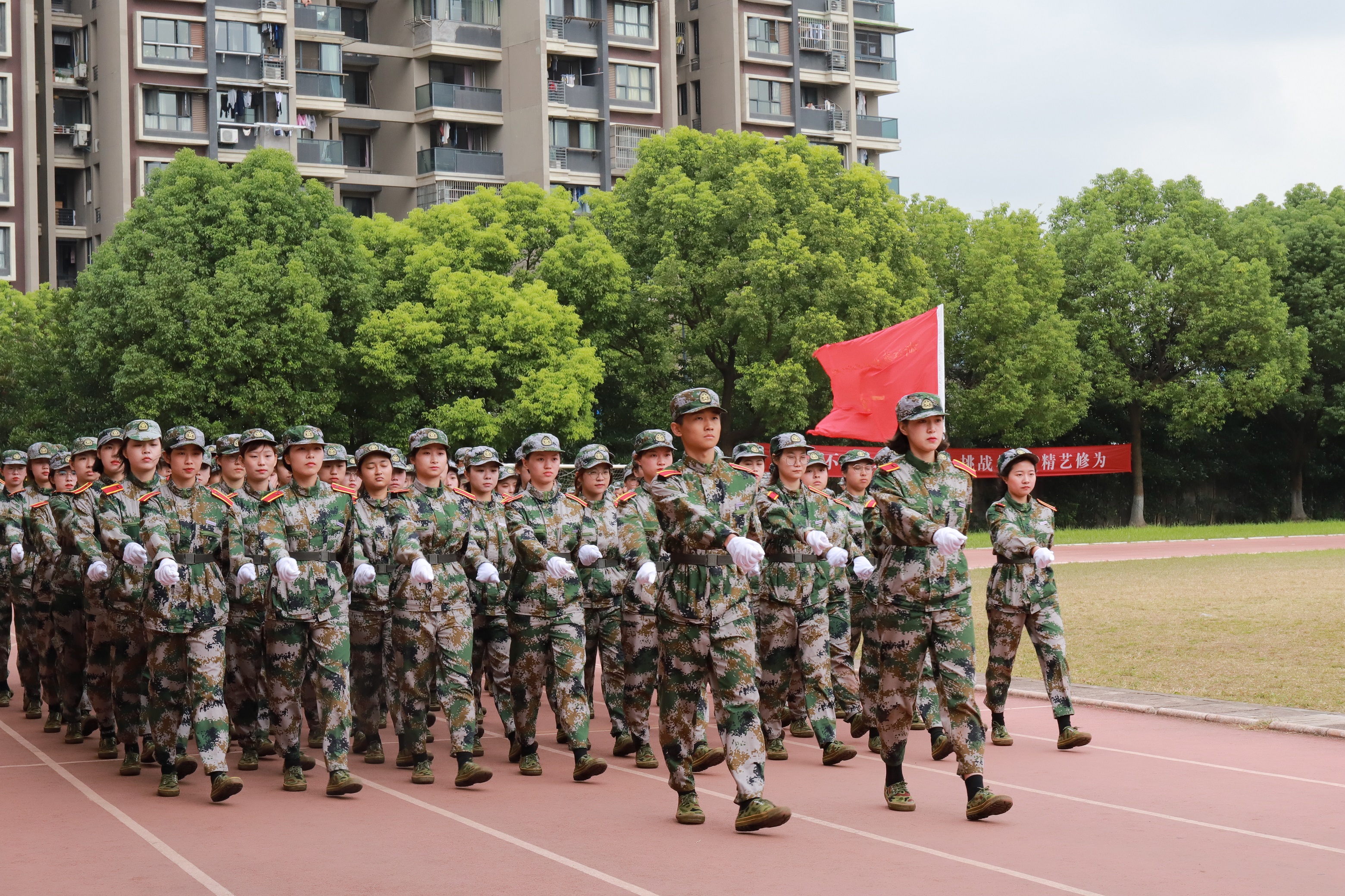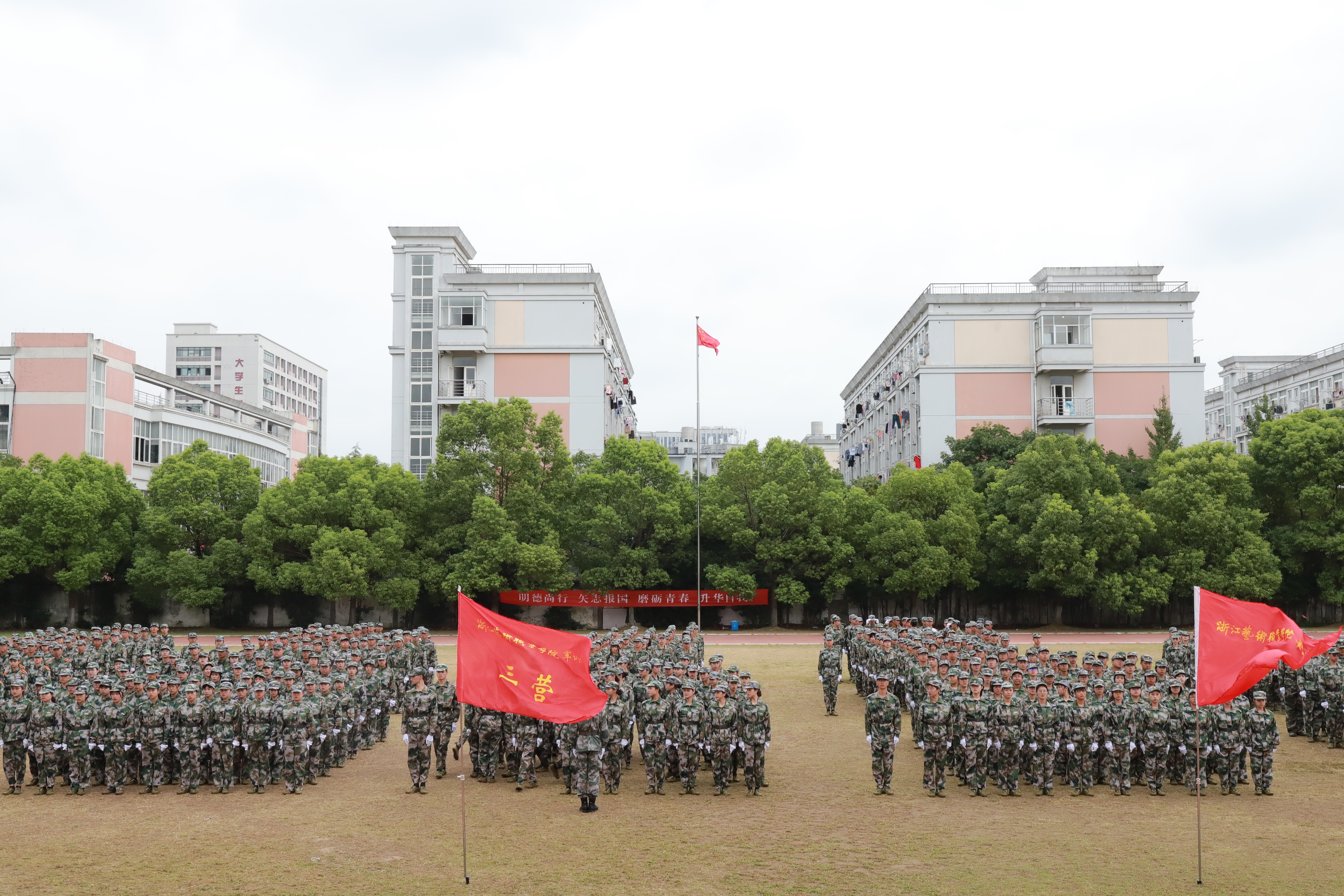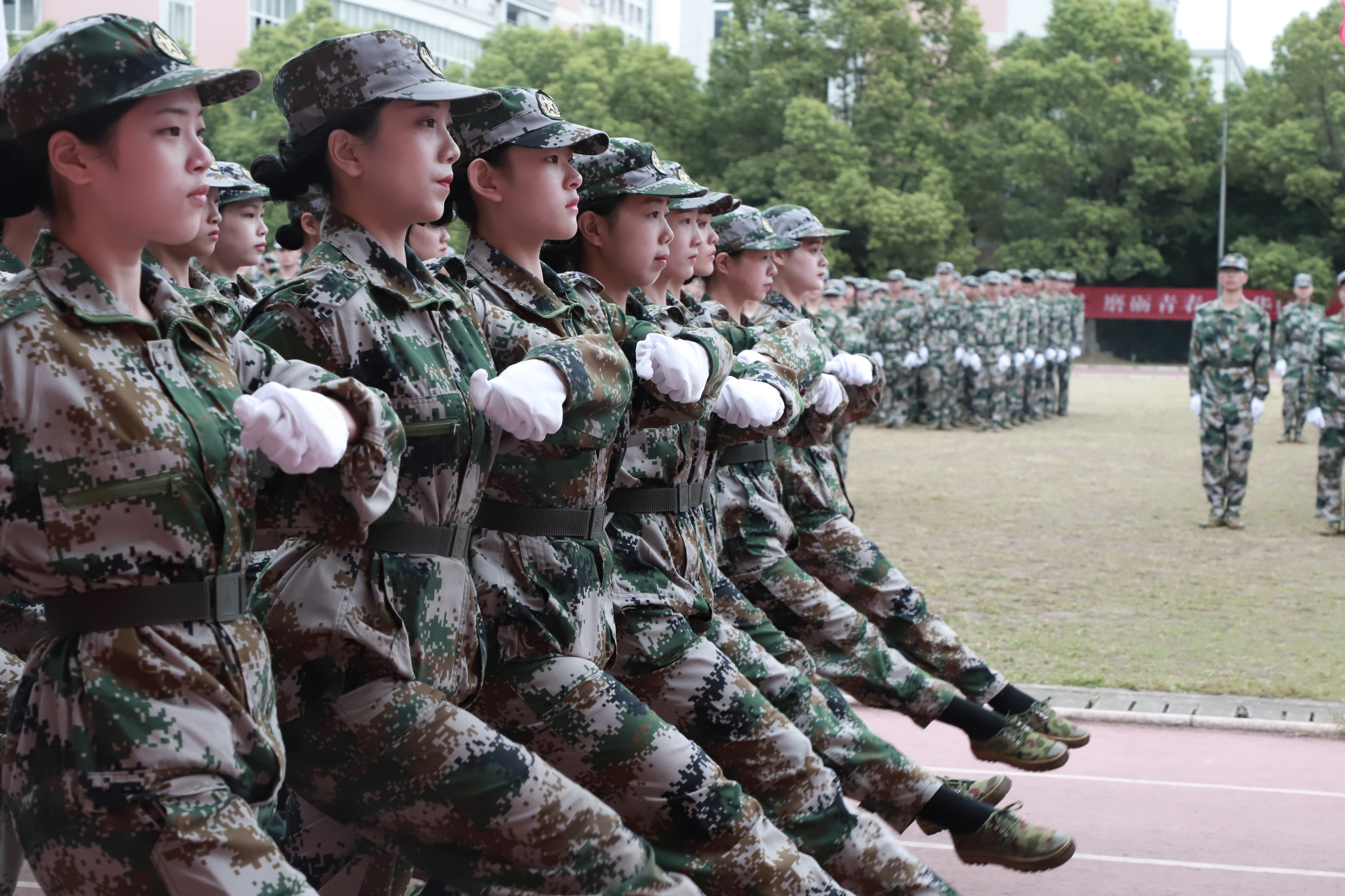 各营连新生进行会操表演,经过13天刻苦训练,他们步伐整齐,精神抖擞,目光炯炯有神,展现了浙艺学子的青春风采和精神风貌。