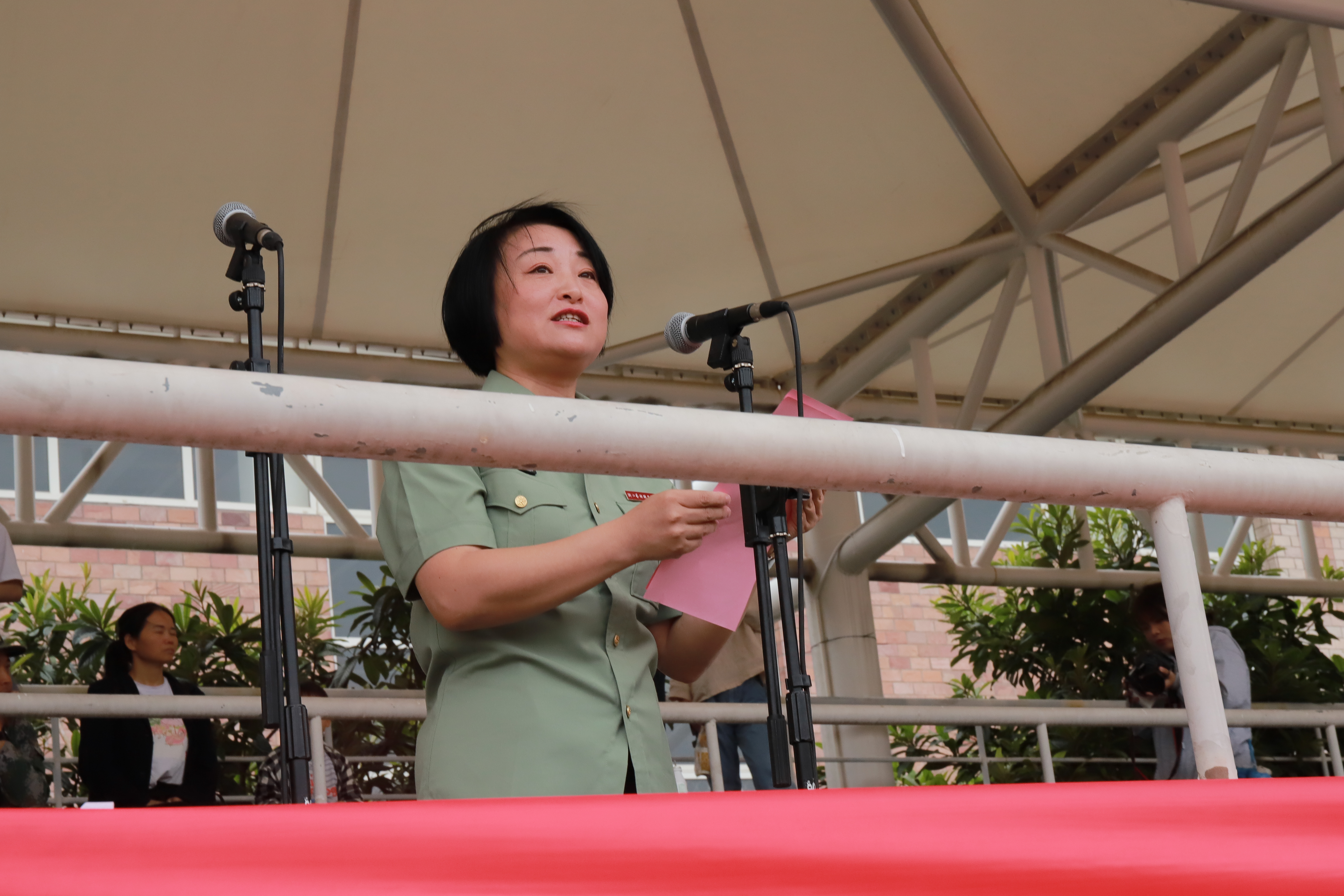 支涛作讲话。她代表学校向中国人民解放军某部队的全体教官表示了衷心感谢,向参训的全体同学表示慰问。她希望同学们在大学生活中,把个人梦融入中国梦,实现人生价值。在学习生活中能够秉承“求真 尚美 精艺 修为”的校训,勤奋学习,锐意进取,踏实做人,做一名德智体美劳全面发展的浙艺人。