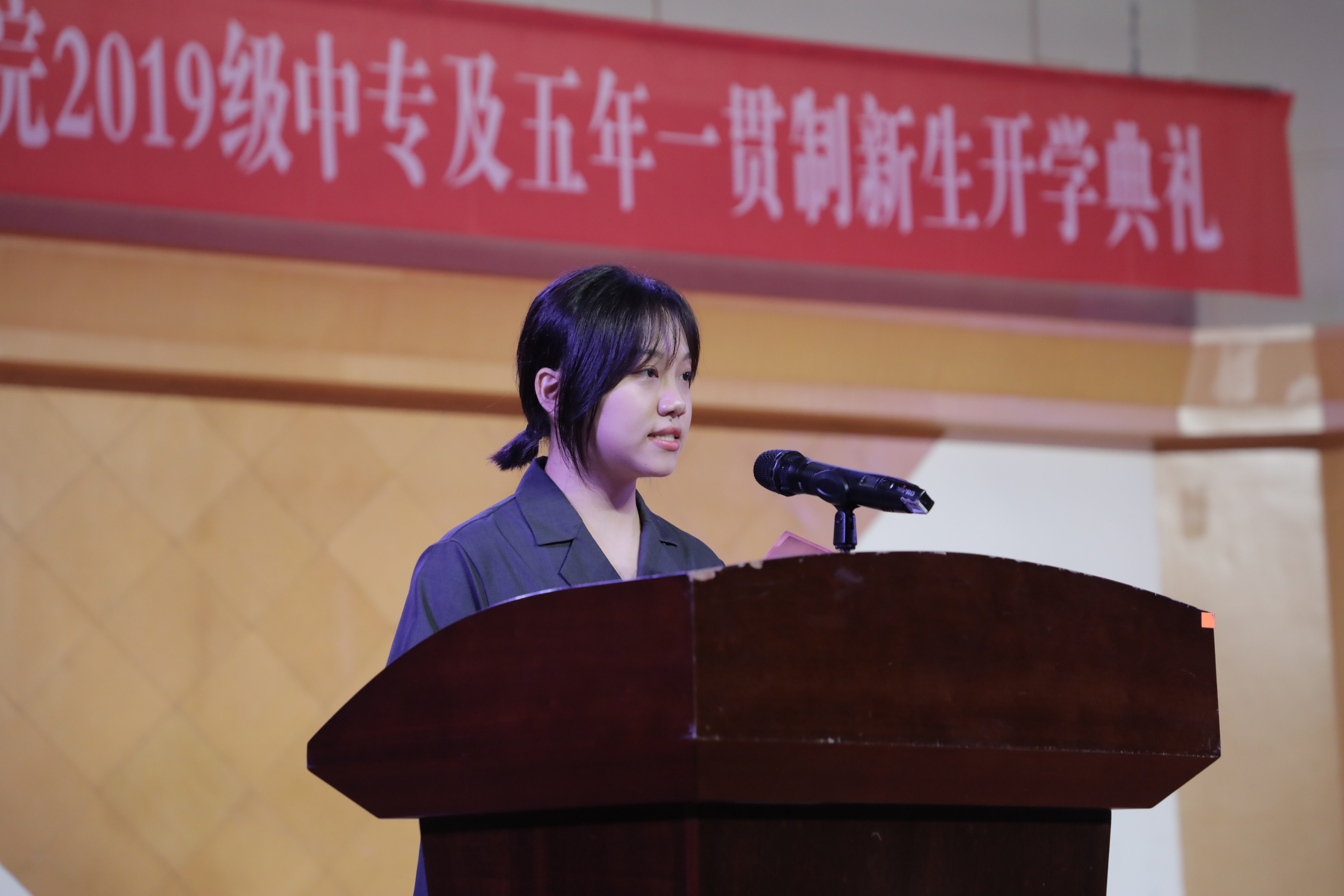 2019级音乐剧班刘思奇作为新生代表发言,表达了自己努力学艺,争取成为一名德艺双馨的艺术人才的愿望。