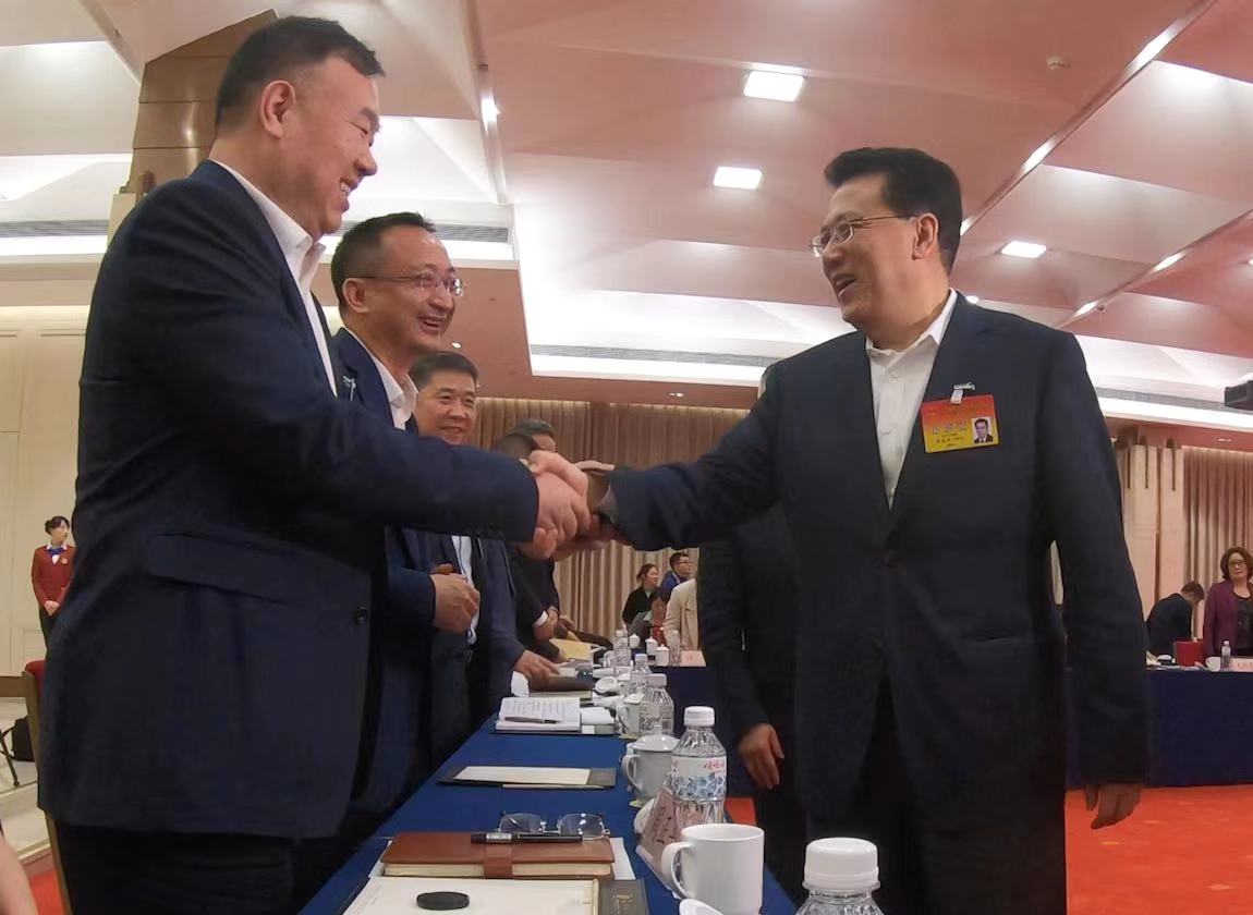 省长袁家军参加省人代会衢州代表团审议政府工作报告,与周正平代表亲切握手