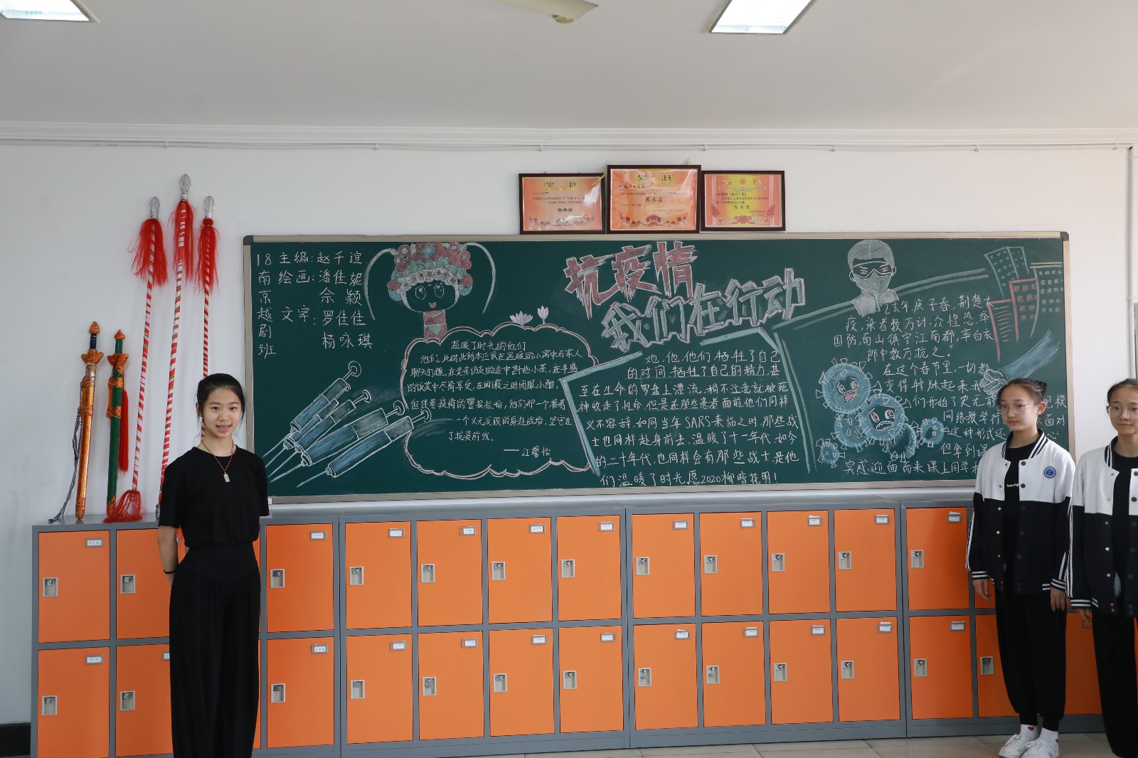 各班级结合疫情,以图文并茂的形式展现最美逆行者抗击疫情的先进事迹,内容丰富,板书书写工整,绘画生动形象。有黑板报分成感党恩、战疫情、续辉煌三部分,表达了同学们只争朝夕、不负韶华、走出精彩、成就辉煌的决心。有用祥云等代表性造型表达了作为龙的传人,防控疫情,人人有责。也有的班级以身披国旗的最美逆行者形象展开,画了武汉黄鹤楼相呼应,板报底部还画了戏曲人物像,表达了作为戏曲人以艺抗疫的担当。同学们设计的板报中,有的内容介绍了防疫妙招、洗手七步法则、心理疏导的途径和联系方式,也有介绍了抗疫中的先进典型人物和感人事迹,还有展现学生在家上网课和复课后教师的教学风采。