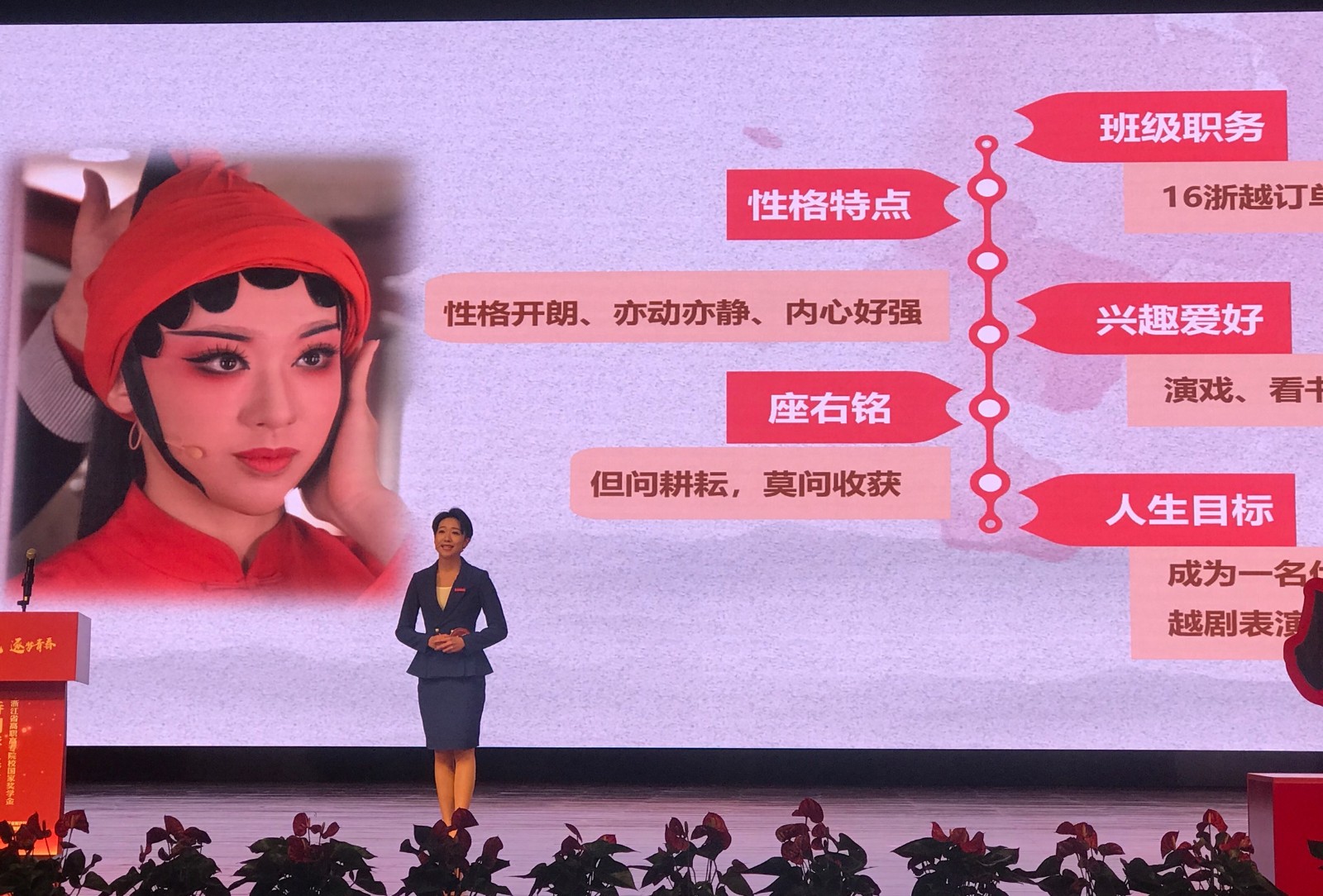 评选前期经过学工部和戏曲学院的精心准备,教学实践部、影视技术系、戏剧系、现教中心通力合作,评选中,陆祎杨展现了浙艺青年积极向上的精神风貌。陆祎杨说:“首先要感谢老师和同学们对我的全力支持和帮助,还要感谢学校对我的培养,给予我这次机会。在今后的求艺道路上,我会更加努力,坚守戏曲艺术的梦想,朝着自己心里的目标奋发前行。”