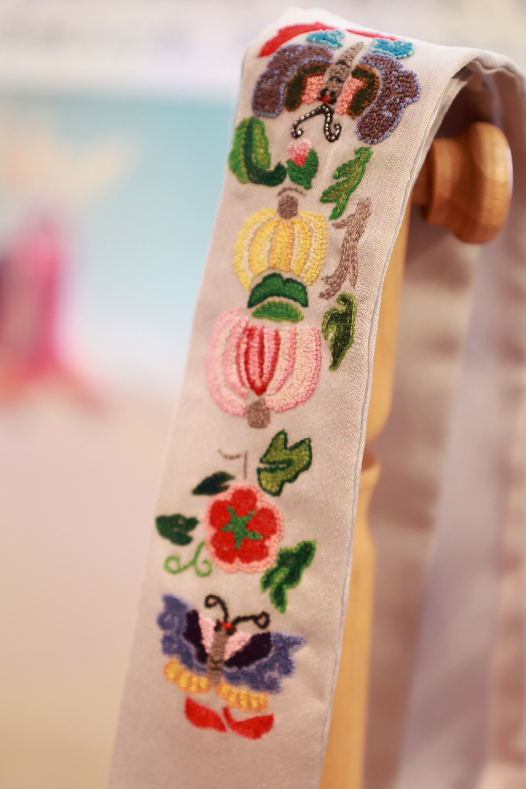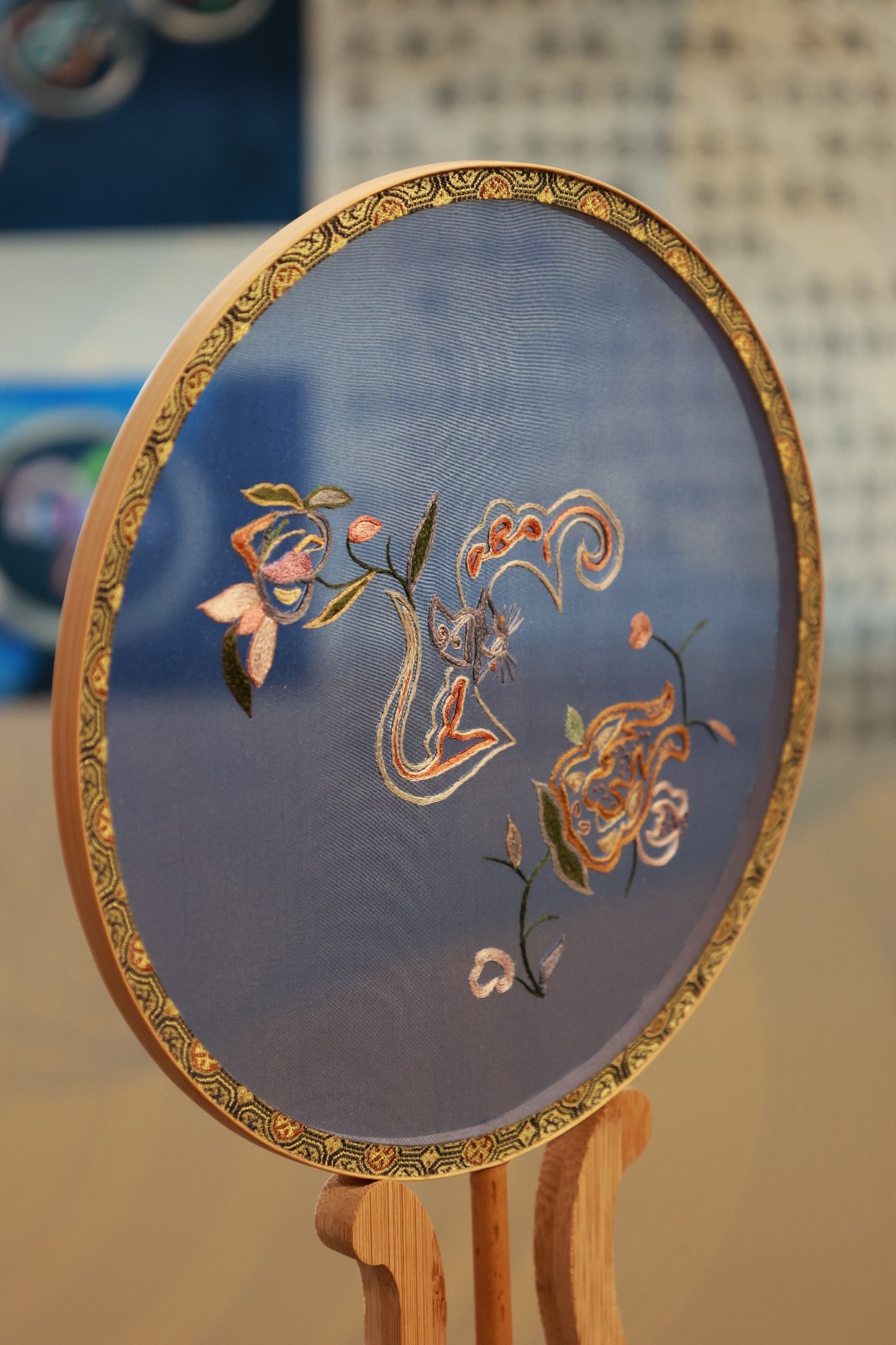 琪花瑶草以屏风为载体,将四个不同季节的花草纹样从古老肚兜绣片中提取出来,重新搭配现代色彩,结合多种针法让图案更具立体感。另有扇面作品以传统纹样、清代绣片图案及齐白石的画作为素材,将美好的传统文化内涵在手作中传递下去。
