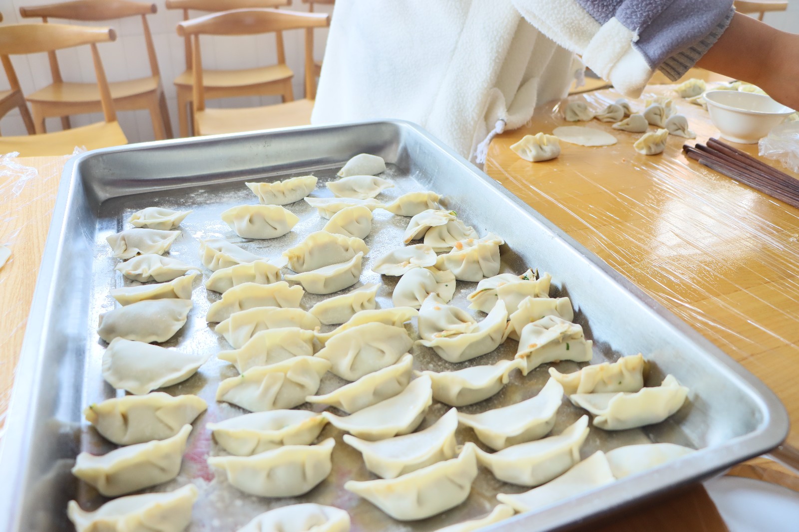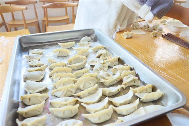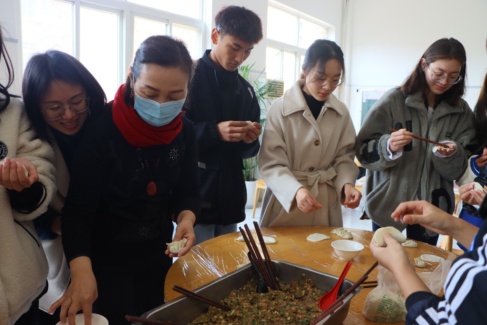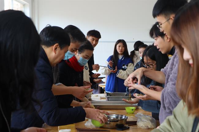 活动中,薛亮与同学们交流了中华各民族关于“年”的习俗,黄杭娟耐心地教同学们如何包饺子,夏开堂细致地询问起同学们在浙艺的学习生活,师生聚在浙艺,其乐融融。