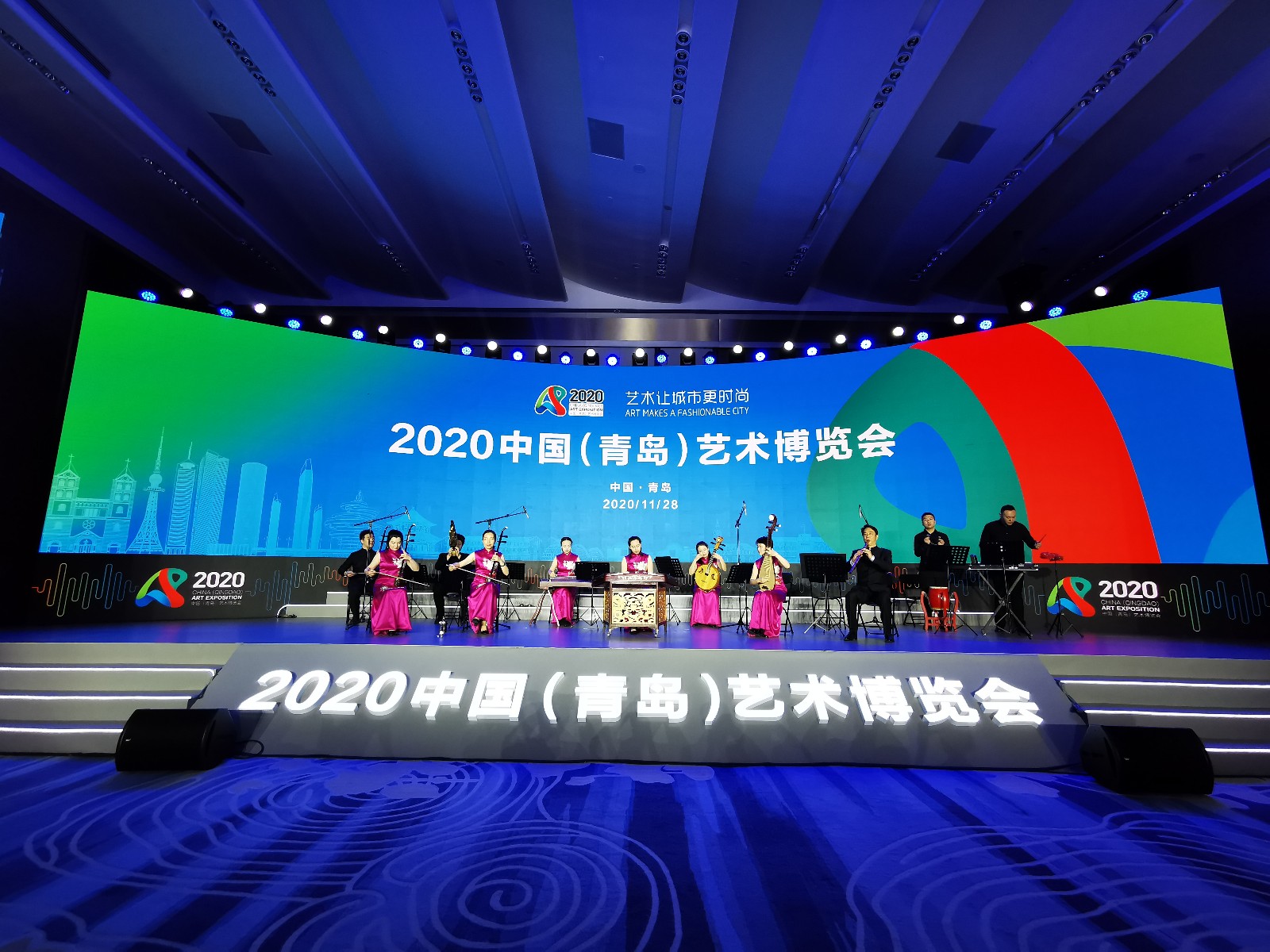 11月28日上午,由中国艺术职业教育学会、中国职业技术教育学会主办的2020中国(青岛)艺术博览会在青岛国际艺术中心开幕,现场举办了一场小而美的音乐会。音乐会由国内知名音乐院校师生联袂演出。因为防疫需要,本届艺博会压缩精选了音乐会内容,全场演出三首曲目:首位登场的是中央音乐学院青年小提琴演奏家劳黎,带来了小提琴曲《阳光照耀塔什库尔干》;第二个节目是我校“江南丝竹音乐演奏团”的江南丝竹音乐《小霓裳》,压轴节目是中国艺术职业教育学会副会长、著名胡琴演奏家、中国音乐学院教授沈诚带来的板胡独奏《月牙五更》。