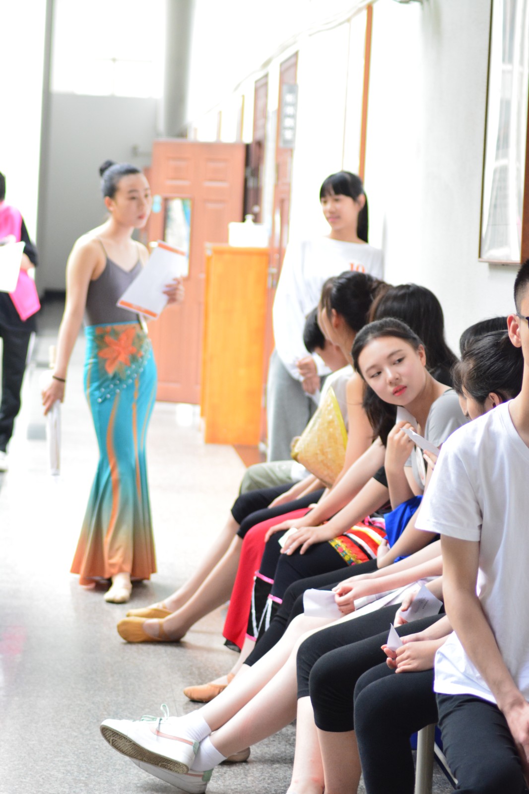 清晨,5号楼内,考官、考务人员、志愿者早早就绪等待考生进场。候考室内,志愿者宣讲了考试流程,贴心地给候考同学分发小零食,缓解紧张情绪。考生们抓紧时间练习舞蹈,朗诵台词,开嗓,耐心等待考试。音乐剧专业需要有一定艺术专业基础,专业面试从声乐、形体、台词、视唱练耳四个方面综合考量考生的专业素质,考官由浙艺和浙传的专业老师共同组成。