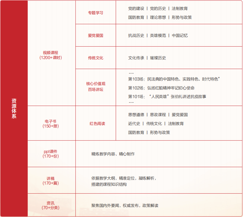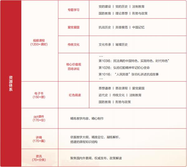 《思政云课堂》汇聚中共中央党校(国家行政学院)、北京大学、北京师范大学等马克思主义理论学科领域知名专家,提供最权威的高校思政数字教学资源服务。该课堂通过知识点视频组成的课程、PPT课件、WORD讲稿、资讯、电子书等多种信息呈现方式,其中视频清晰度达到高清以上,汇聚精品思政资源内容。