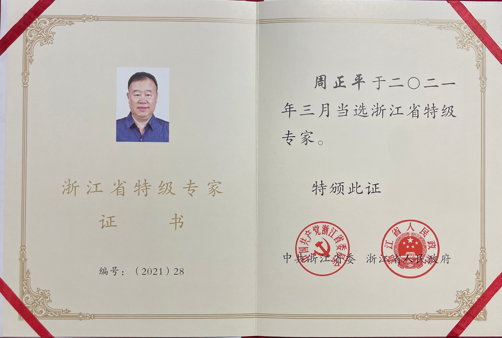 我校教授周正平在浙江省科学技术奖励大会上获颁“浙江省特级专家”