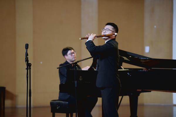 我校音乐系竹笛专业教师常轶伟带来了一首充满西域风情的《胡旋舞》。该曲由台湾作曲家钟耀光作曲,原是一首西洋长笛曲2010年经中央音乐学院博士生导师戴亚教授改编后作为当年台北笛子大赛决赛规定曲目,是目前笛曲中技术难度较大的作品。作为浙艺音乐系民乐教研室青年教师代表的常轶伟,自2020年荣获“新松计划”浙江省青年演奏员大赛吹奏组一等奖后,此番再度亮相舞台,带来了精彩纷呈的出色演绎。