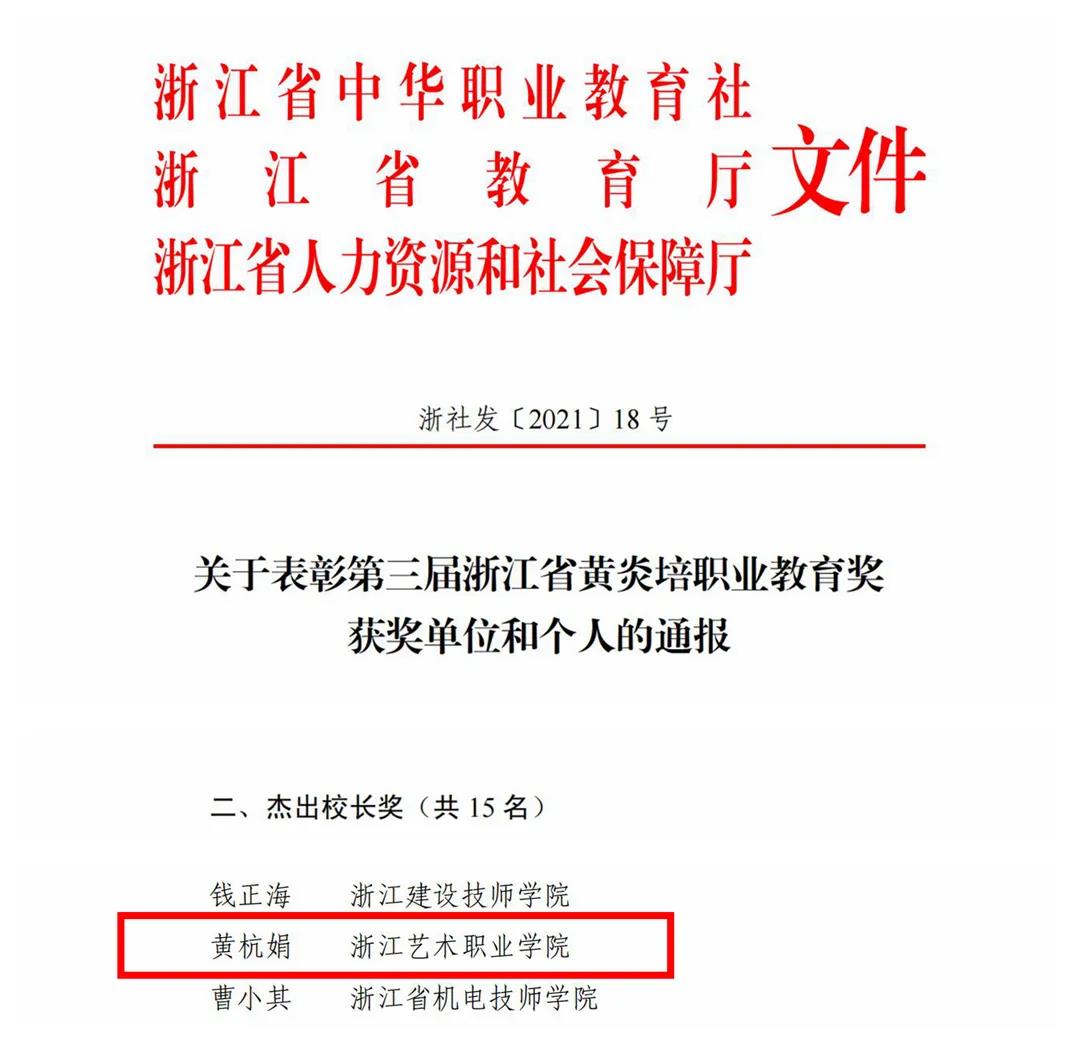 近日,一则喜讯在浙江艺术职业学院里传开,院长、党委副书记黄杭娟荣获第三届浙江省黄炎培职业教育奖杰出校长奖