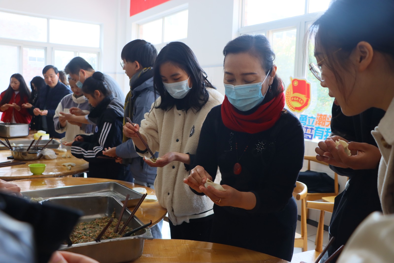 布置疫情防控开学演练,走访寝室,与学生一起包饺子