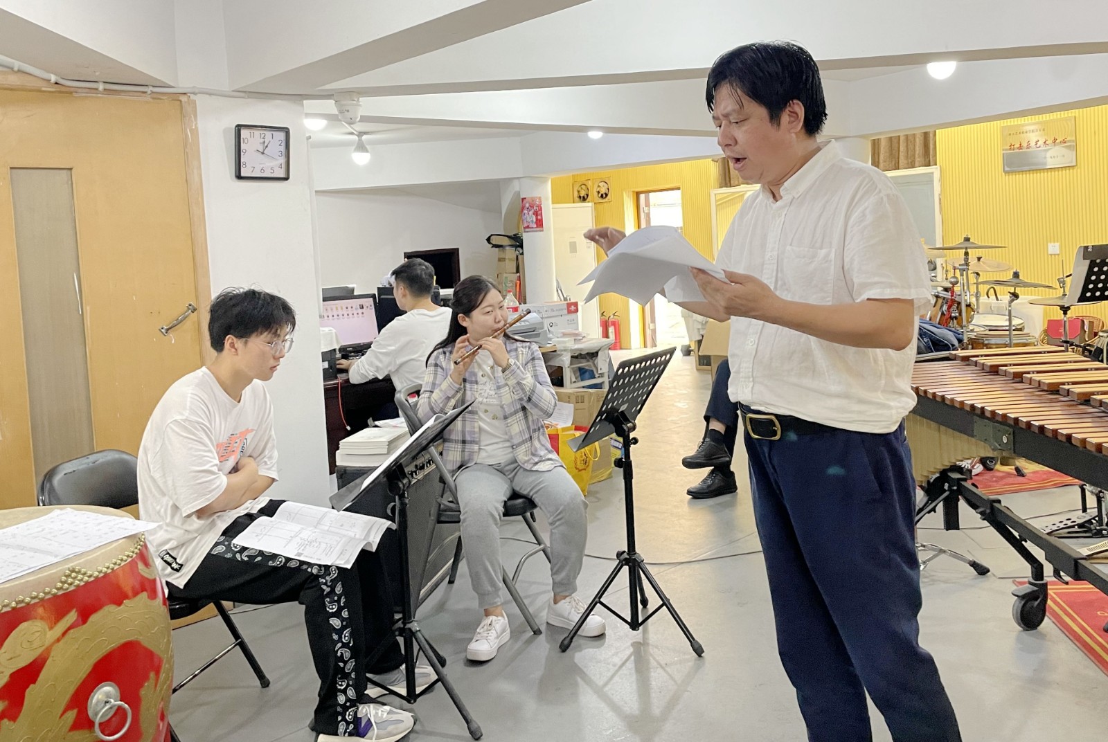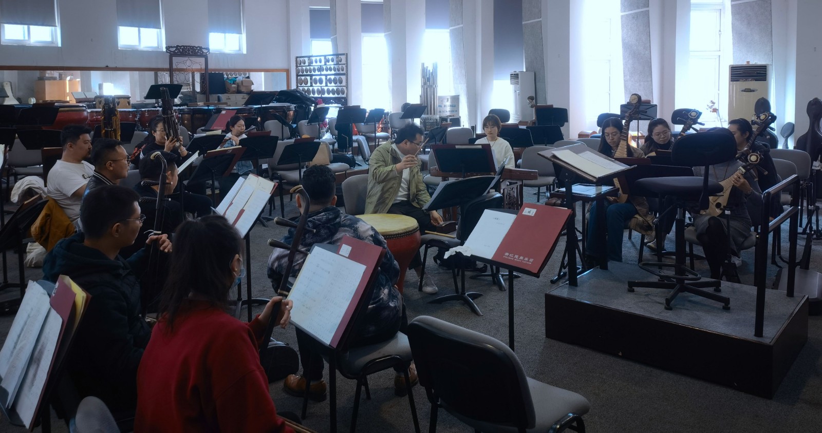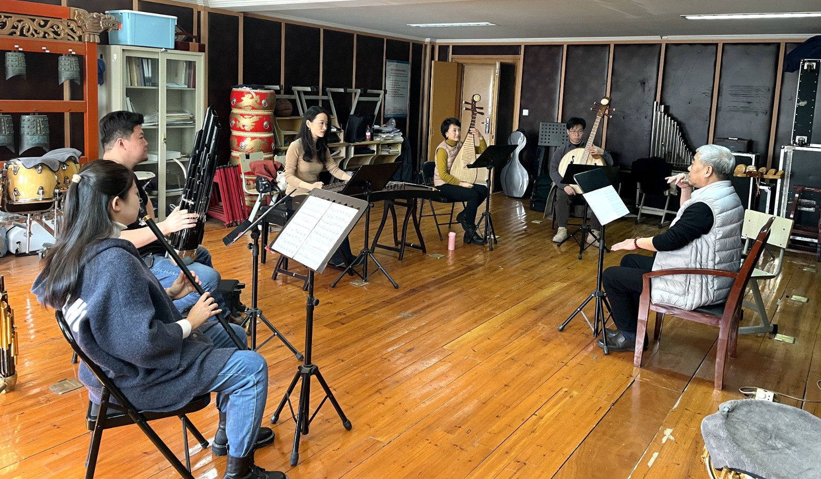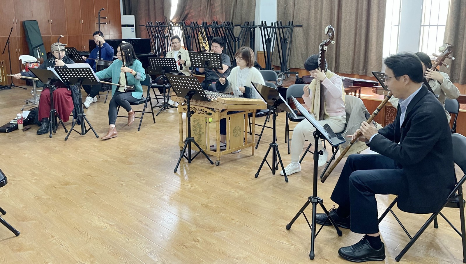 做民乐专场调度很关键,包峥剡坦言,演出节奏要把握好,要抢时间摆放好道具,中间不能有停顿,要连贯流畅,不然会影响观看效果。演职人员将近160人,一个人就要把话筒、凳子、琴等搬运摆放好,画外音也要在规定时间内做好。