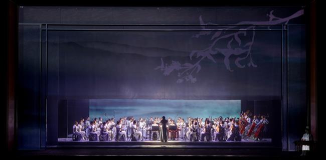 《听见江南》的意境美在演出当晚给观众留下了深刻印象。为了在舞台上营造出像古代花窗一样透视的效果,特意把有些演出乐队安排在舞台靠后的位置。《灯月交辉》中服装用了三种不同的红色形成层次,舞台上虚实结合,其中月亮的设计与半角亭是空间透视的效果,也有视觉夸张的设计。在宽幕布上打上树枝,舞台画面很有层次感。《良渚回响》中把舞台空间分成了两部分,让两个空间里的演员有互动交流。之前在良渚博物馆参观时,看到的象形文字、原始洞穴、年画底色等都对包峥剡设计这个节目有所启发。