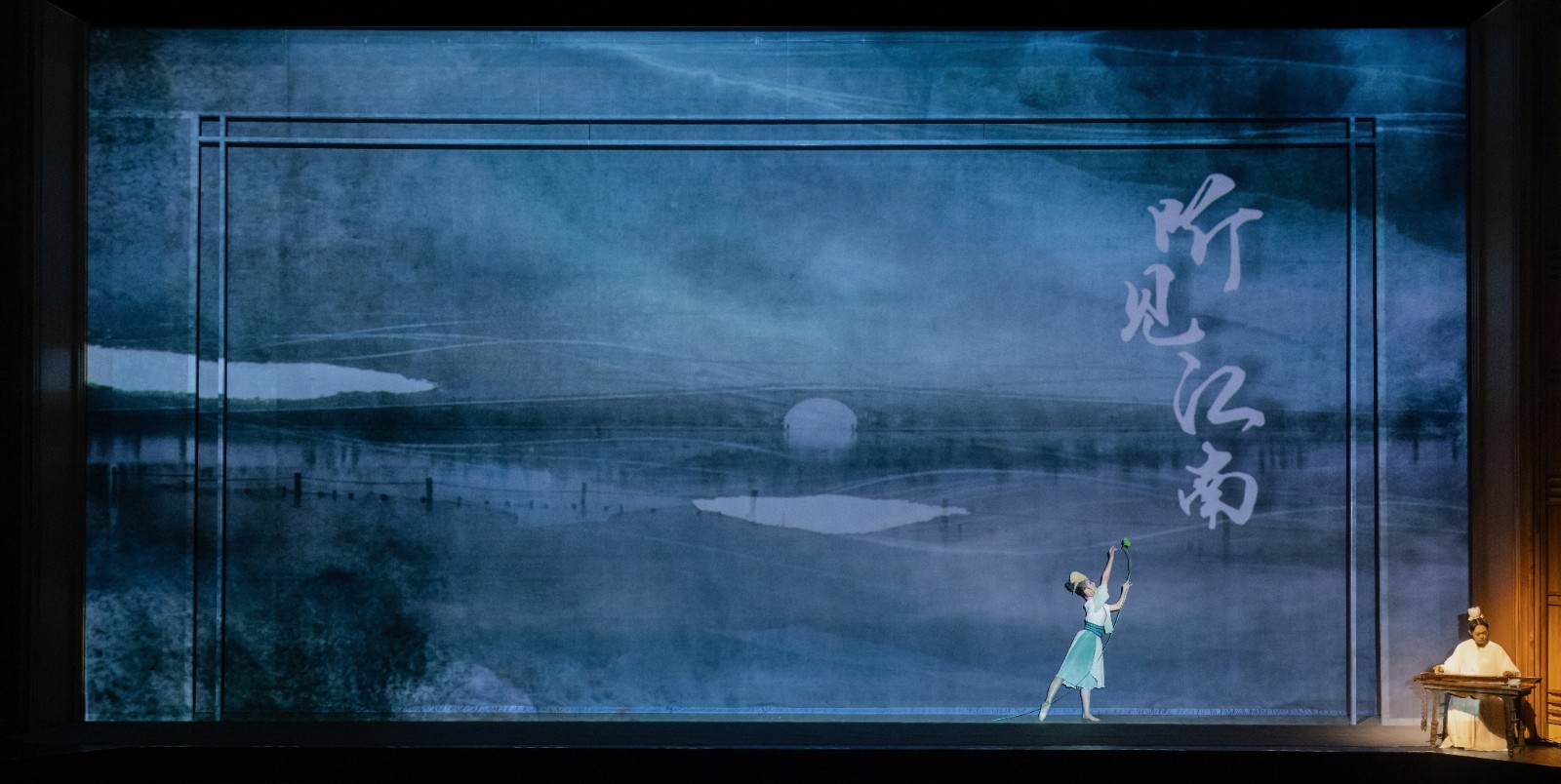 演出一开始就很直观,屏幕上是略微动态的画面,上面呈现了“听见江南”四个字,画面就是一层灰蓝色,既有“古”的气息,又映衬出演员服装。边上的投影、LED屏、冰屏等都呈现出多维透视。整台演出在服饰上不像戏曲那么讲究,也不要求复古,而是解构元素来表现整体,比如男演员在抢妆时头上戴朵花,就体现出宋韵元素。整台演出精致明净,在传统中融合了现代感,引起了观众的共鸣。