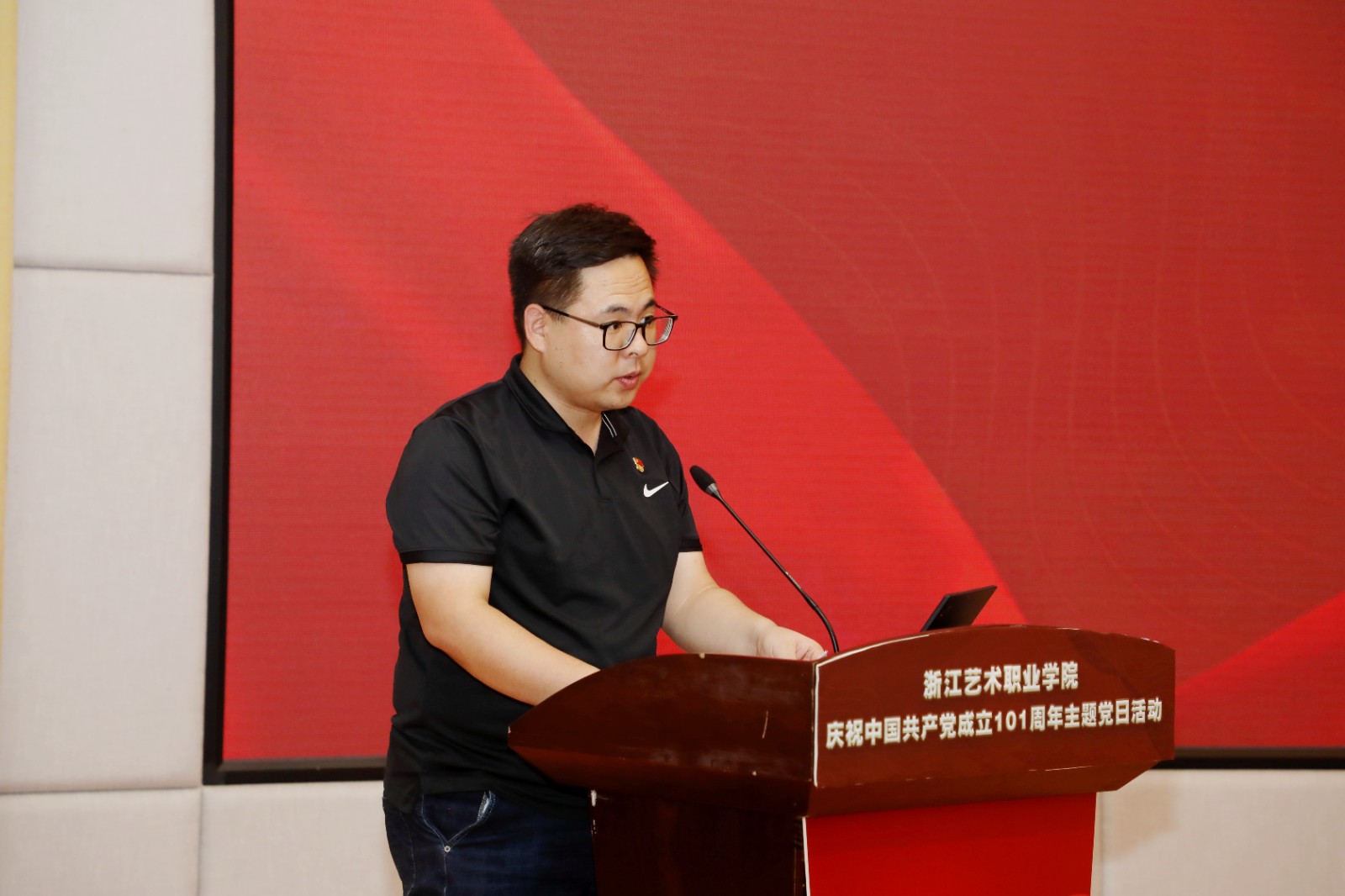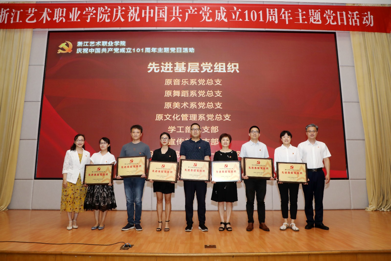 为庆祝中国共产党成立101周年,回顾党的光辉历程,讴歌党的丰功伟绩,赓续红色血脉,浙江艺术职业学院在学校图信报告厅隆重举行庆祝中国共产党成立101周年主题党日活动。校党委班子成员,各党总支、直属党支部书记、副书记,全体中层干部、主管岗位人员,基层党支部书记、组织员和师生党员代表、学校“两优一先”受表彰对象、2022年发展的新党员代表参加活动。校党委书记薛亮作省十五次党代会精神宣讲,院长、党委副书记黄杭娟宣读表彰名单,校党委副书记夏开堂主持活动。