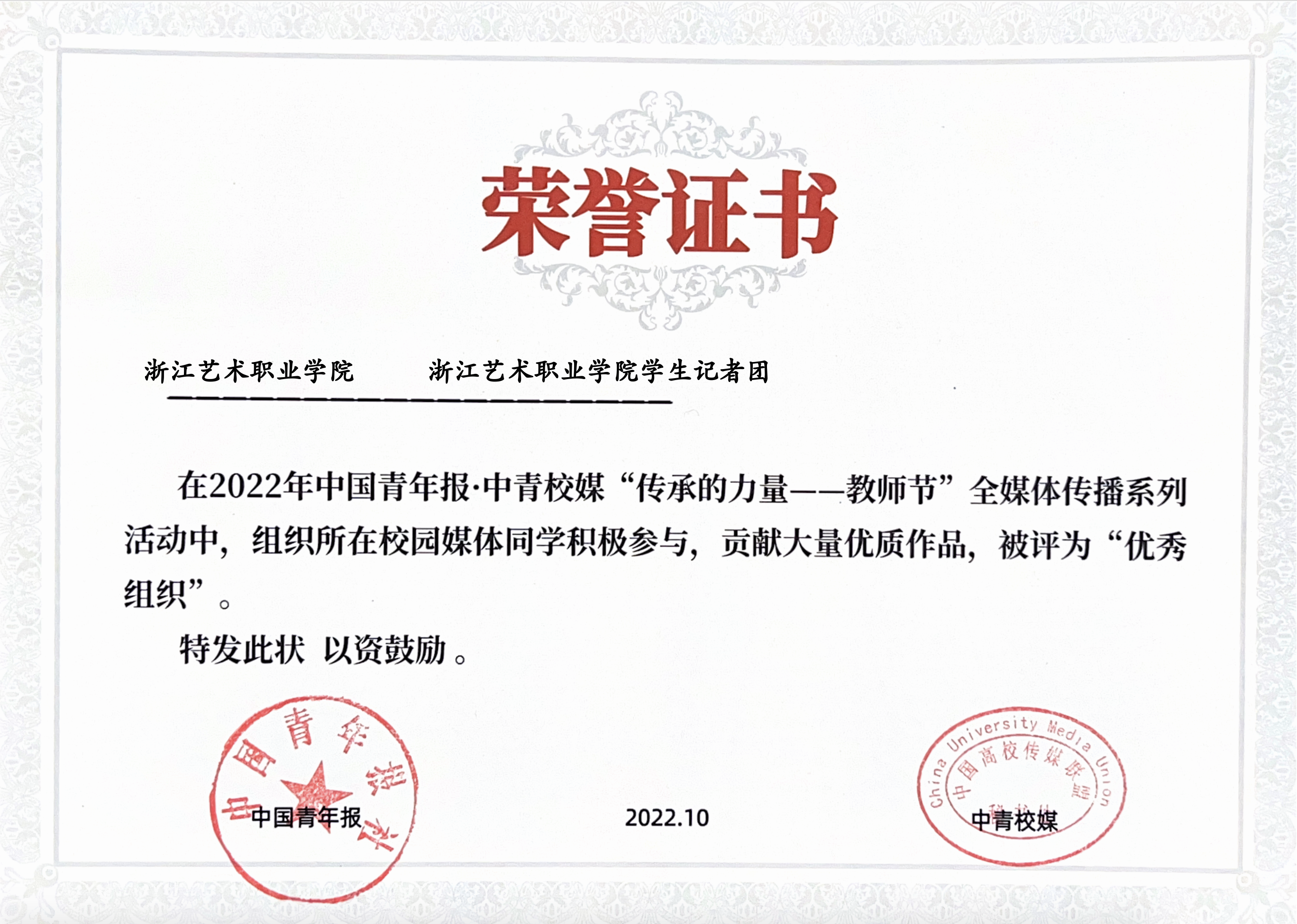 在2022年上半年公布的2021年度浙江省优秀教育新媒体评选活动结果中,浙艺荣获浙江省高校(高职高专)新媒体综合力十强。在2021年浙江教育政务新媒体传播力月排行榜和2022年季度排行榜中,浙艺多次进入全省高职院校前十强。在2022年中国青年报·中青校媒“传承的力量——教师节”全媒体传播系列活动中被评为“优秀组织”。