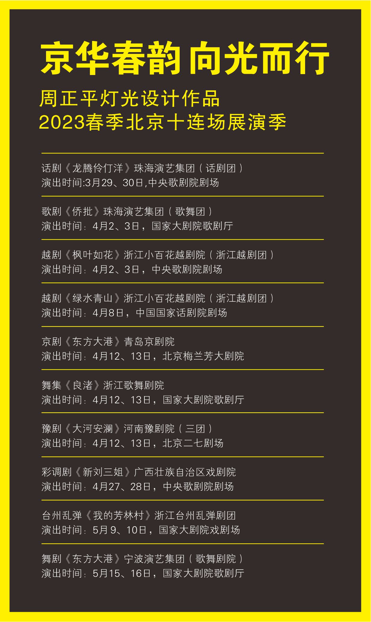 初春光作序,京城戏连台。3月29日至5月16日,“京华春韵 向光而行”——周正平灯光设计作品2023春季北京十连场展演季在北京举行。周正平是浙江艺术职业学院设计学院首席专家,此次灯光设计作品展演季有话剧《龙腾伶仃洋》、歌剧《侨批》、越剧《枫叶如花》、越剧《绿水青山》、舞集《良渚》等10部作品,囊括了话剧、歌剧、舞剧、舞集、越剧、豫剧、彩调剧、台州乱弹等艺术样式。