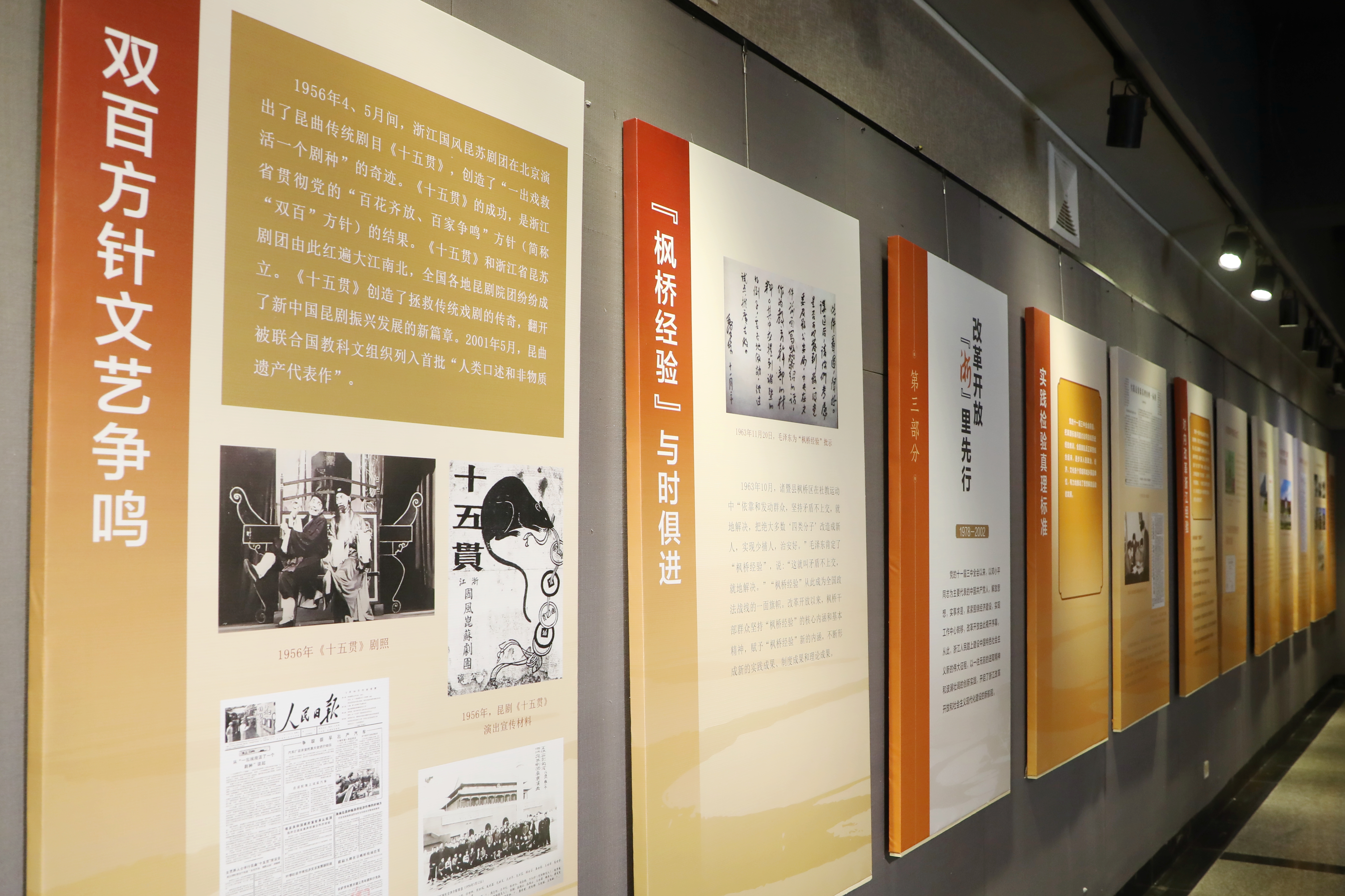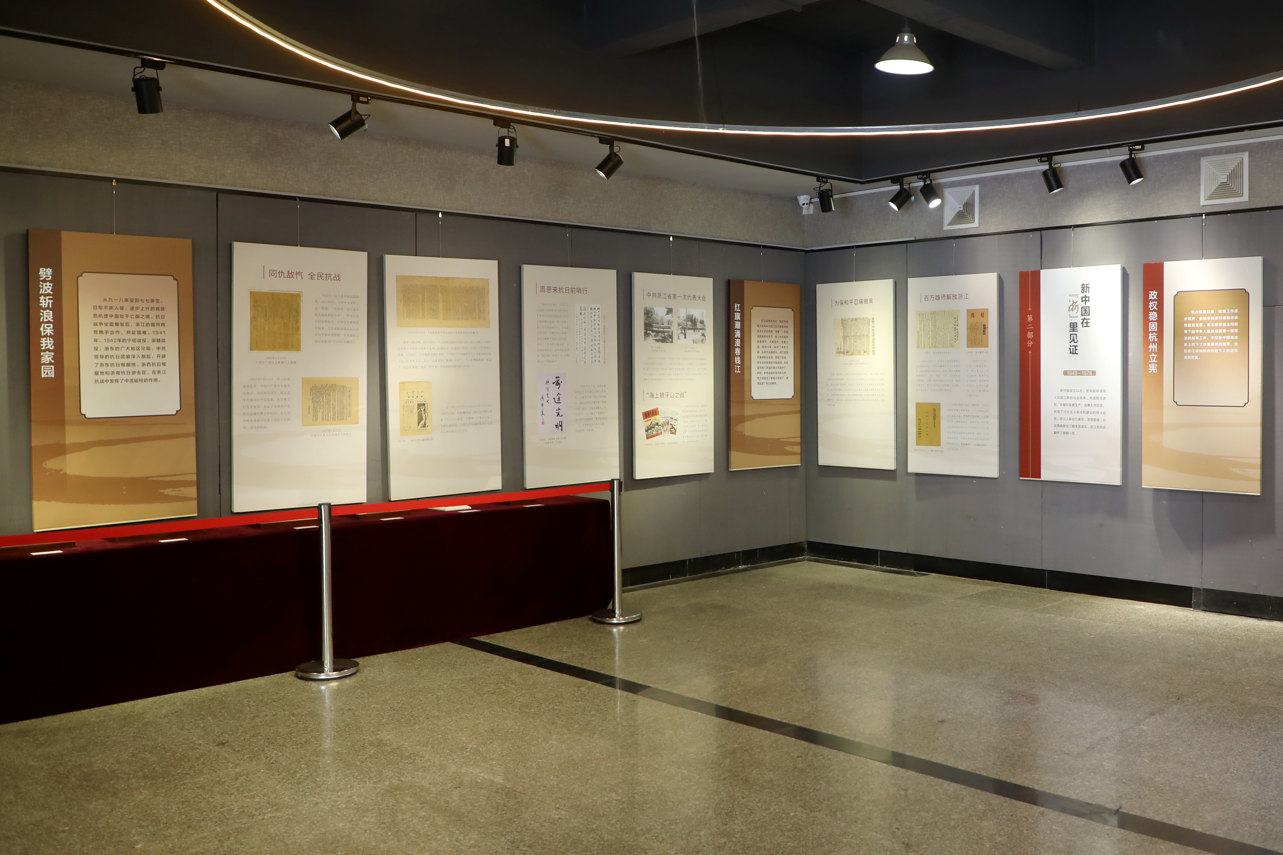 展览首先通过《浙江新潮》等革命文献文物,以“扬帆起航、冲破迷雾、劈波斩浪、红旗潮涌”为单元,阐述了中国共产党从初创至崛起的历史;同时回顾新中国成立后“政权在杭立宪”“恢复发展国民经济”“艰苦奋斗开拓创新”的史实,以“中美建交”“三大改造”等国际国内措施,体现浙江在重大决策面前的伟大实践;随后聚焦“实践检验真理标准、对内改革浙江经验、对外开放贸易强者、科教兴国产业集群”四个板块,陈列《人民日报》《解放日报》等革命文献史料,强有力地证明了浙江始终走在党中央重大决策第一线;最后着重“绿色发展美丽浙江”“文化赋能城乡一体”等新时代战略,以“五水共治”“打造文化精品”等多项落地工程展示浙江如何有力推动高质量发展。