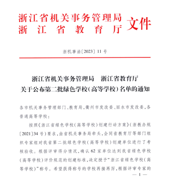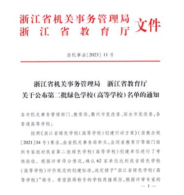 近日,浙江省机关事务管理局、浙江省教育厅公布全省第二批绿色学校(高等学校)名单,我校荣获“浙江省绿色学校(高等学校) 三星等级”称号。