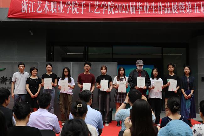 5月30日,“宋韵•拾遗”手工艺学院2023届毕业生作品展暨“巧艺传承 匠心筑梦”第五届“浙艺手艺”节在立业园开幕。浙江艺术职业学院党委书记薛亮,党委委员、副院长沈军甫,浙江励行文化科技有限公司修复部经理张哲,浙江省创意设计协会副秘书长范倩怡,江苏华艺时装集团股份有限公司人力资源部经理韩加梅,招聘主管薛棉尹,学校相关部门负责人以及手工艺学院师生参加开幕式。