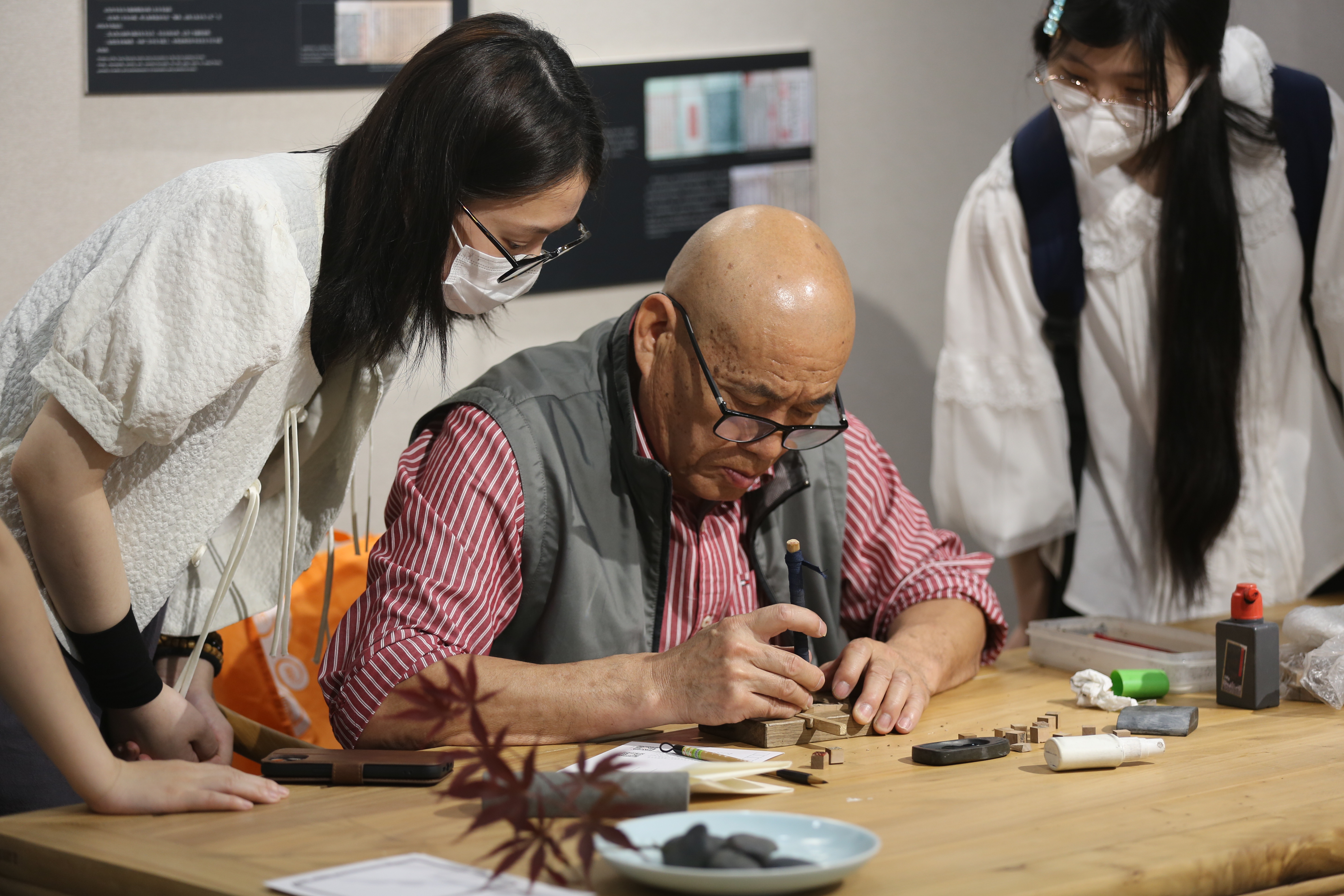 王钏巧走进手工艺学子课堂,现场为同学们展示了木活字印刷术中最为关键的一个步骤——书写与雕刻。王师傅一双布满老茧的手稳稳当当地篆刻着厘米小的木块,呈现出生动的线条和精致的纹理,一雕一刻间尽显传统技艺的魅力,吸引了同学们驻足学习,向文物专业的学子们敞开了木活字印刷这一中国古老技术的大门。