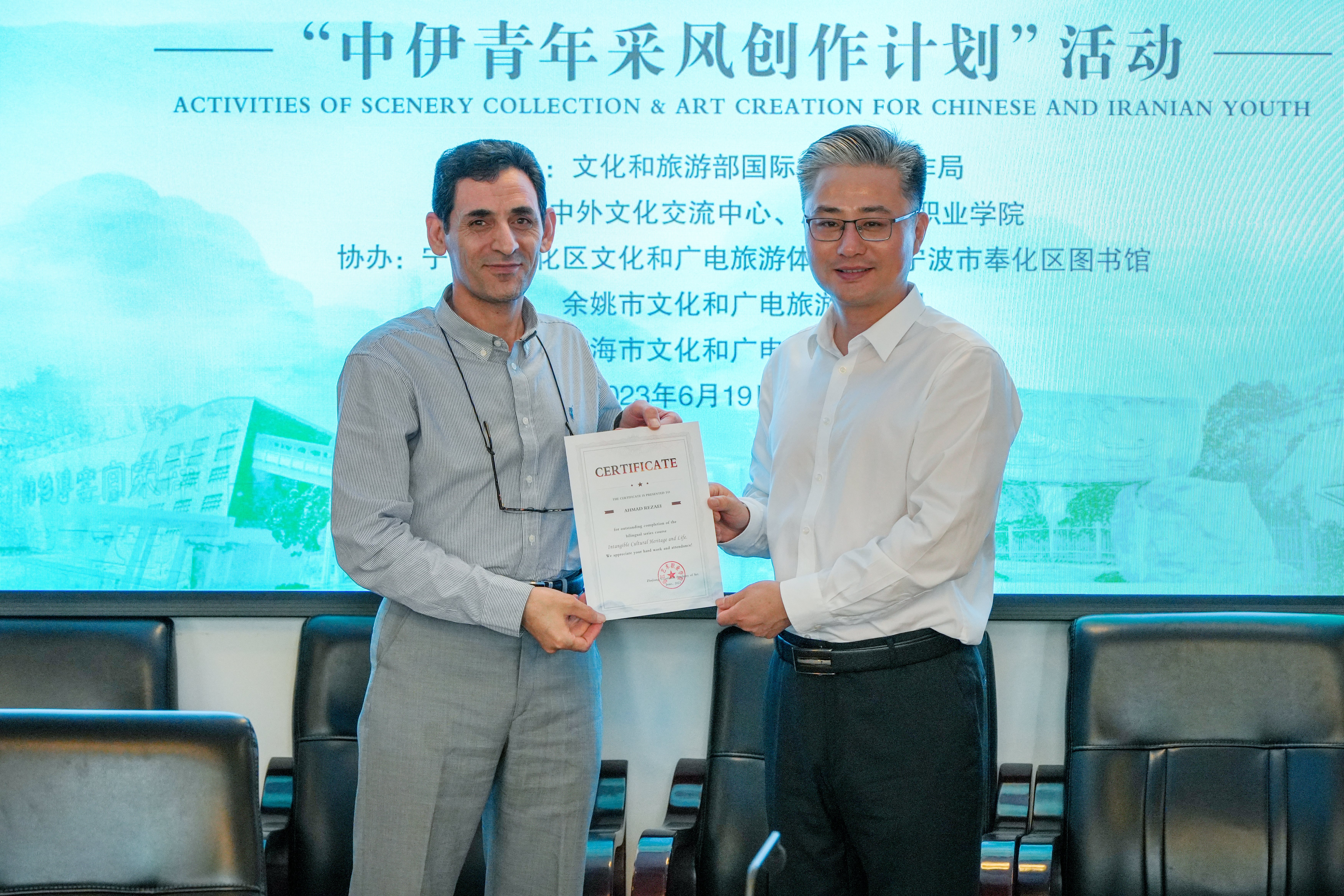 为进一步促进中伊两国的文化交流,提升伊朗青年对中国文化和旅游资源的认知,由文化和旅游部国际交流与合作局主办,中外文化交流中心、浙江艺术职业学院承办,宁波市奉化区文化和广电旅游体育局、宁波市奉化区图书馆、余姚市文化和广电旅游体育局、临海市文化和广电旅游体育局协办的“中伊青年采风创作计划”活动于6月19日至23日在浙江举行。