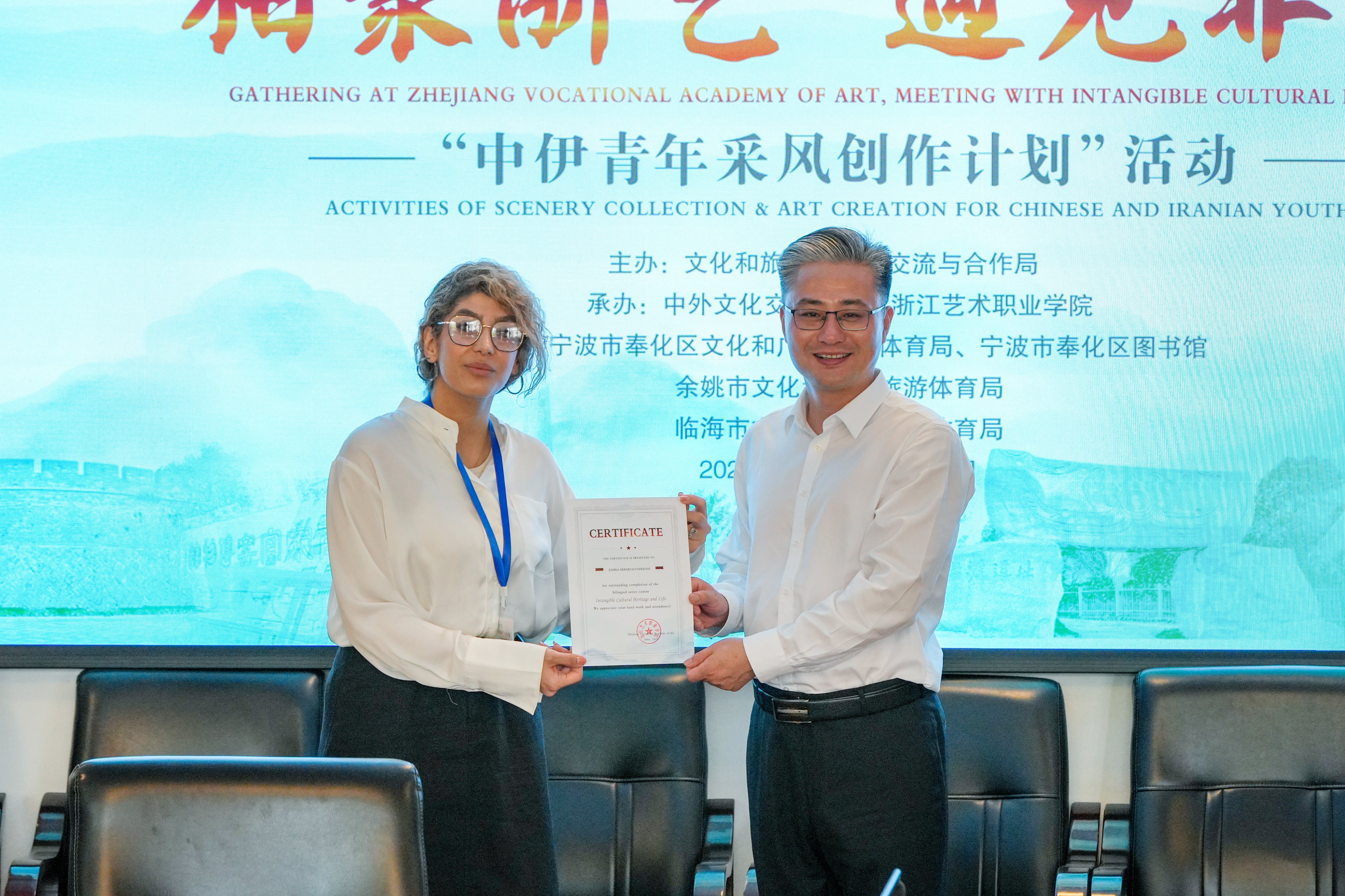 浙江艺术职业学院作为承办方,依托全国非遗传承人研究研习基地、省级非遗传承与研究基地、教育部“双师型”教师培养培训基地,积极筹备、广泛联络、精心策划非遗课程和活动方案,伊朗青年学者与浙江艺术职业学院师生一道,与地方文旅广电局一起,圆满完成了曲艺、非遗技艺的学习和课程输出。