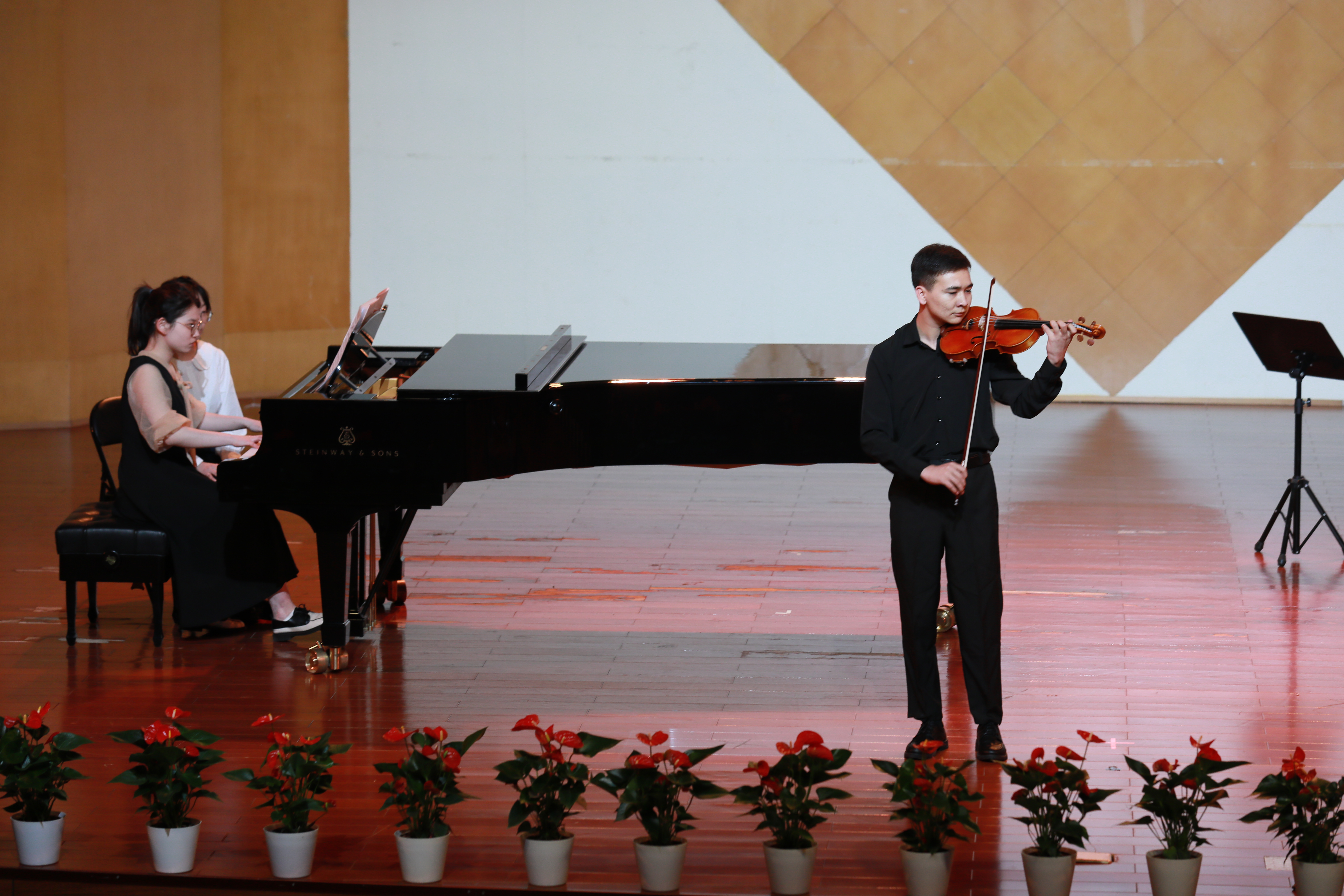 玉米提同学演绎了小提琴独奏《花儿为什么这样红》,熟悉的旋律经玉米提同学的演奏韵味十足,运用西洋乐器充分表现了新疆的音乐风格。在舞蹈学院学习的祖拜代·艾麦尔身着新疆传统服饰,表演了一段极具特色的独舞《阿图什》。全体演奏人员共同演绎了一首展现多民族和谐共处和对祖国深情祝福的器乐合奏曲《昆仑之春》,音乐会在欢腾的旋律、热烈的舞蹈中落下了帷幕。