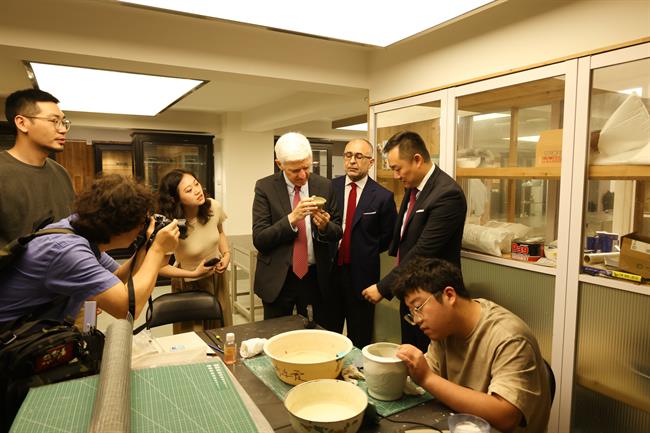 Massimo Bray一行观摩了浙江艺术职业学院戏曲学院、舞蹈学院的教学情况,欣赏了音乐学院的节目演出,参观了手工艺学院文物修复、古籍修复、陶艺实训室等,对浙江艺术职业学院的深厚办学底蕴与近年高速发展有了更直观的了解,为双方进一步合作奠定了基础。