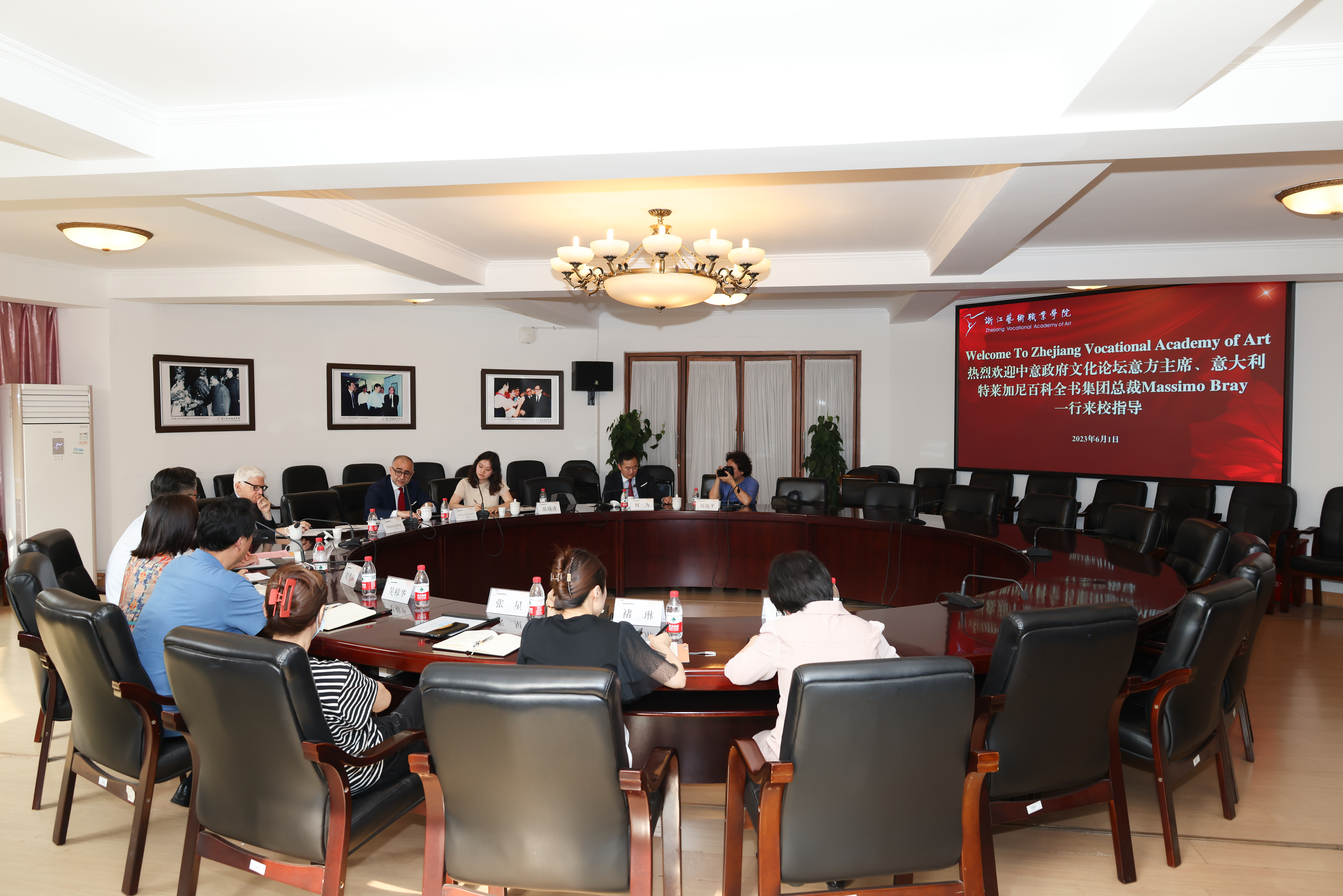 6月1日下午,中意政府文化论坛意方主席、意大利特莱加尼百科全书集团总裁Massimo Bray一行访问浙江艺术职业学院。意大利驻沪总领事馆文化处处长Francesco D’Arelli陪同访问。浙艺校党委书记薛亮会见来宾,相关部门负责人参加座谈。