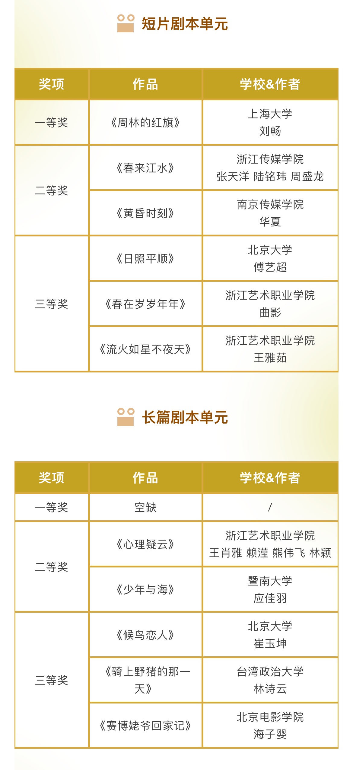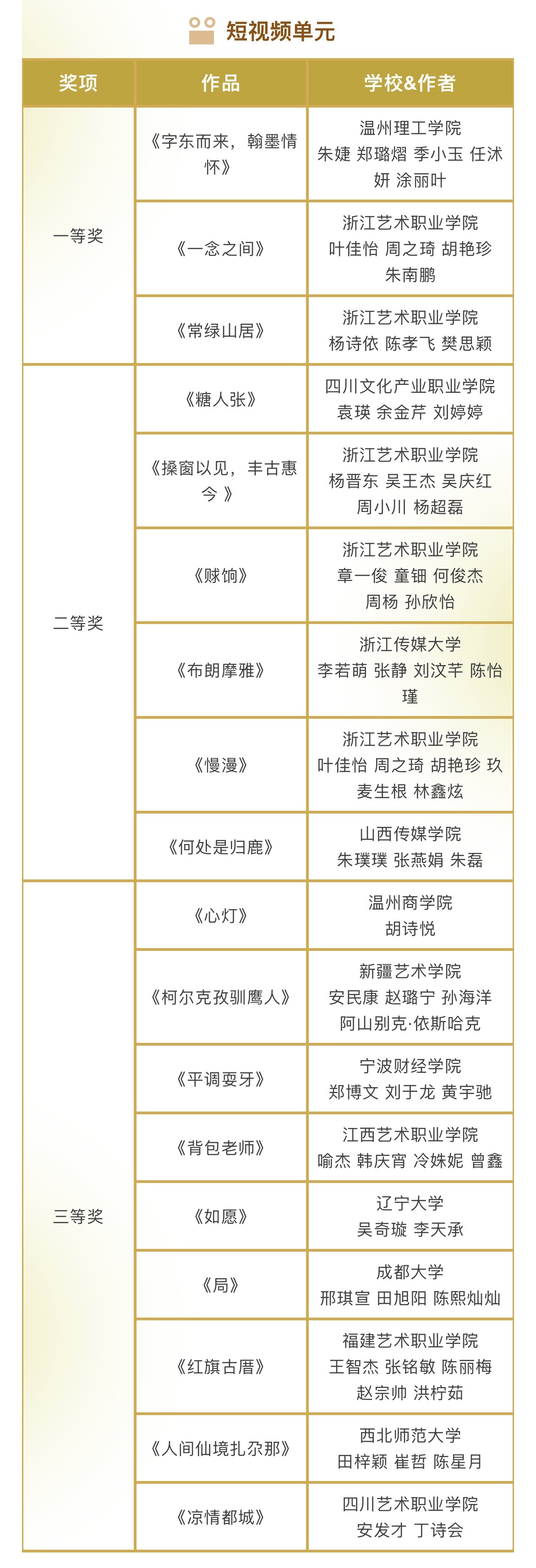 本届金鹄青年电影节共收到来自清华大学、北京电影学院等200所国内外院校的1296件参赛作品,最终有285部作品成功入围。最终,由评委会评选出5个单元的77个奖项以及10个最佳组织单位。具体获奖名单如下: