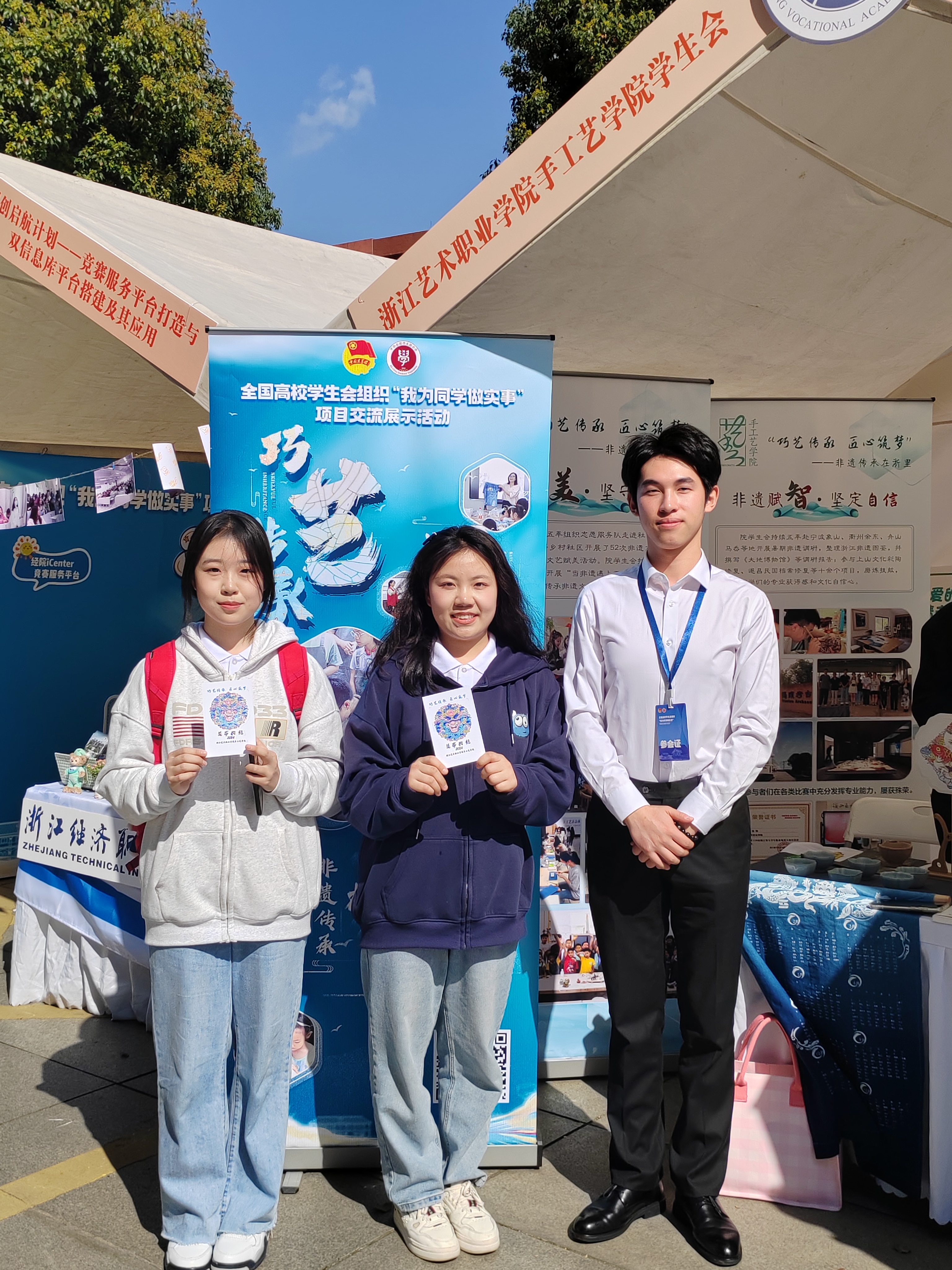 3月22日至24日,浙艺师生赴贵州师范大学参加由团中央指导、全国学联主办、贵州省学联承办的全国高校学生会组织“我为同学办实事”交流展示活动。经省级推报、全国遴选,评委评审、同学满意度调查和学生观察员评议,我校“巧艺传承,匠心筑梦——非遗传承在浙里”项目入选全国100个精品项目和“最受同学欢迎”项目。