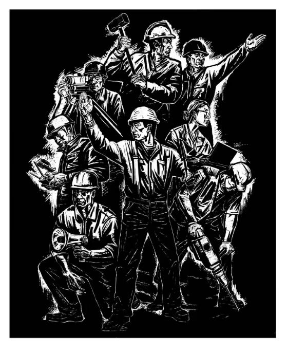 版画作品《基石—致敬劳动者》以黑白木刻的形式,深情地赞颂了那些默默无闻、辛勤付出的劳动者们。作品以纪念碑式的构图、宏大的视角,展现了一幅劳动者们辛勤工作的场景,他们在社会的各个角落,用自己的双手和汗水,为社会的繁荣和进步奠定基石。