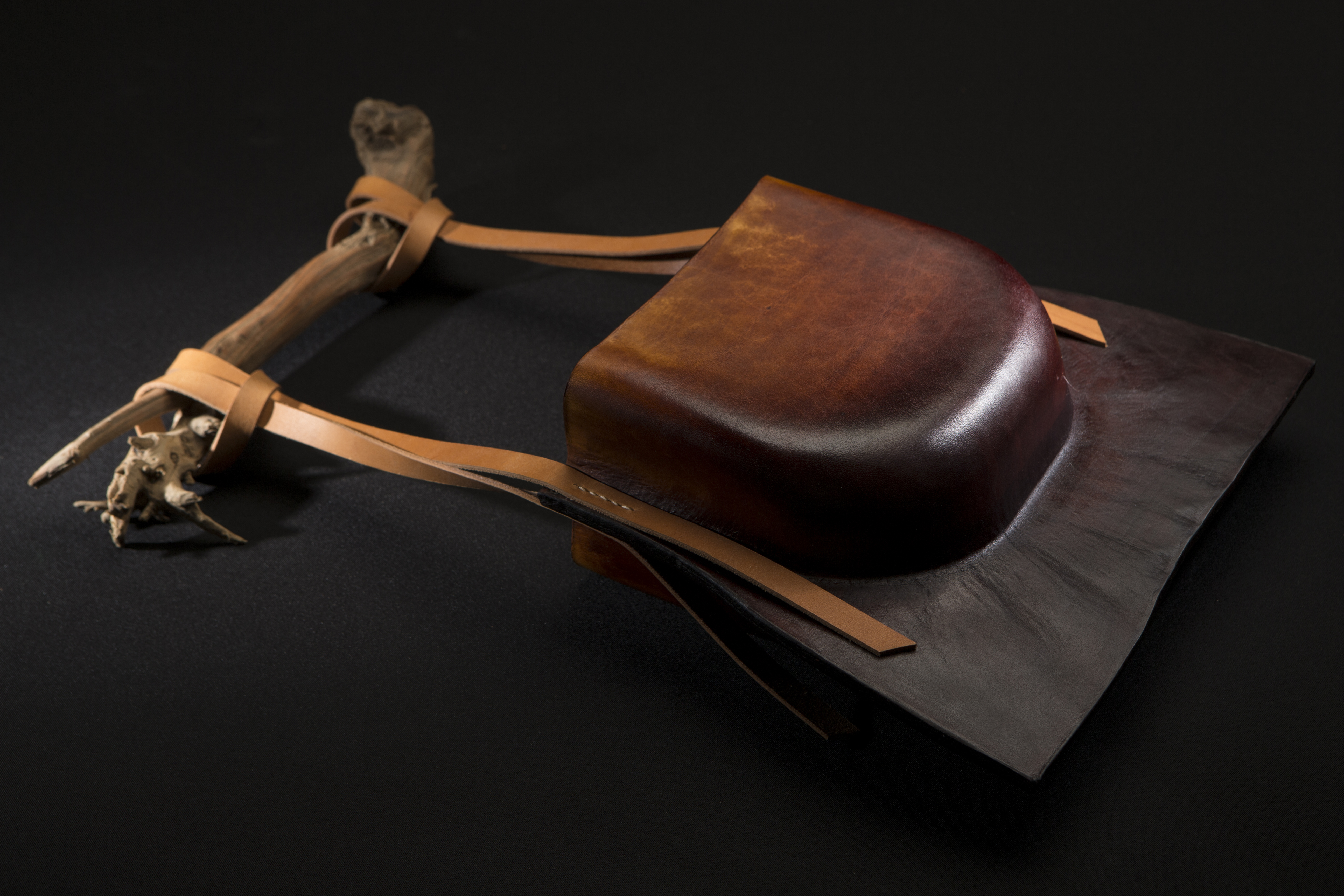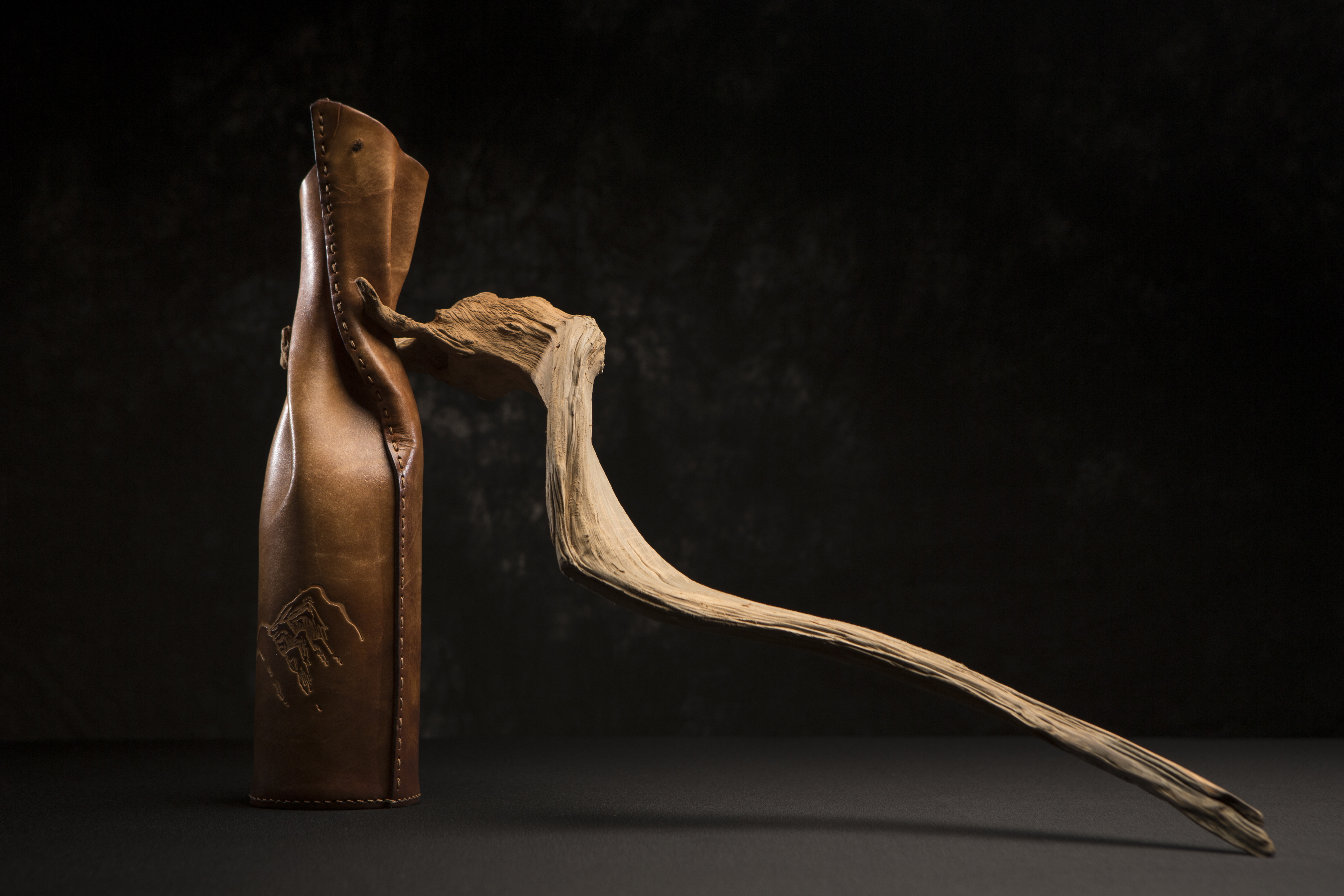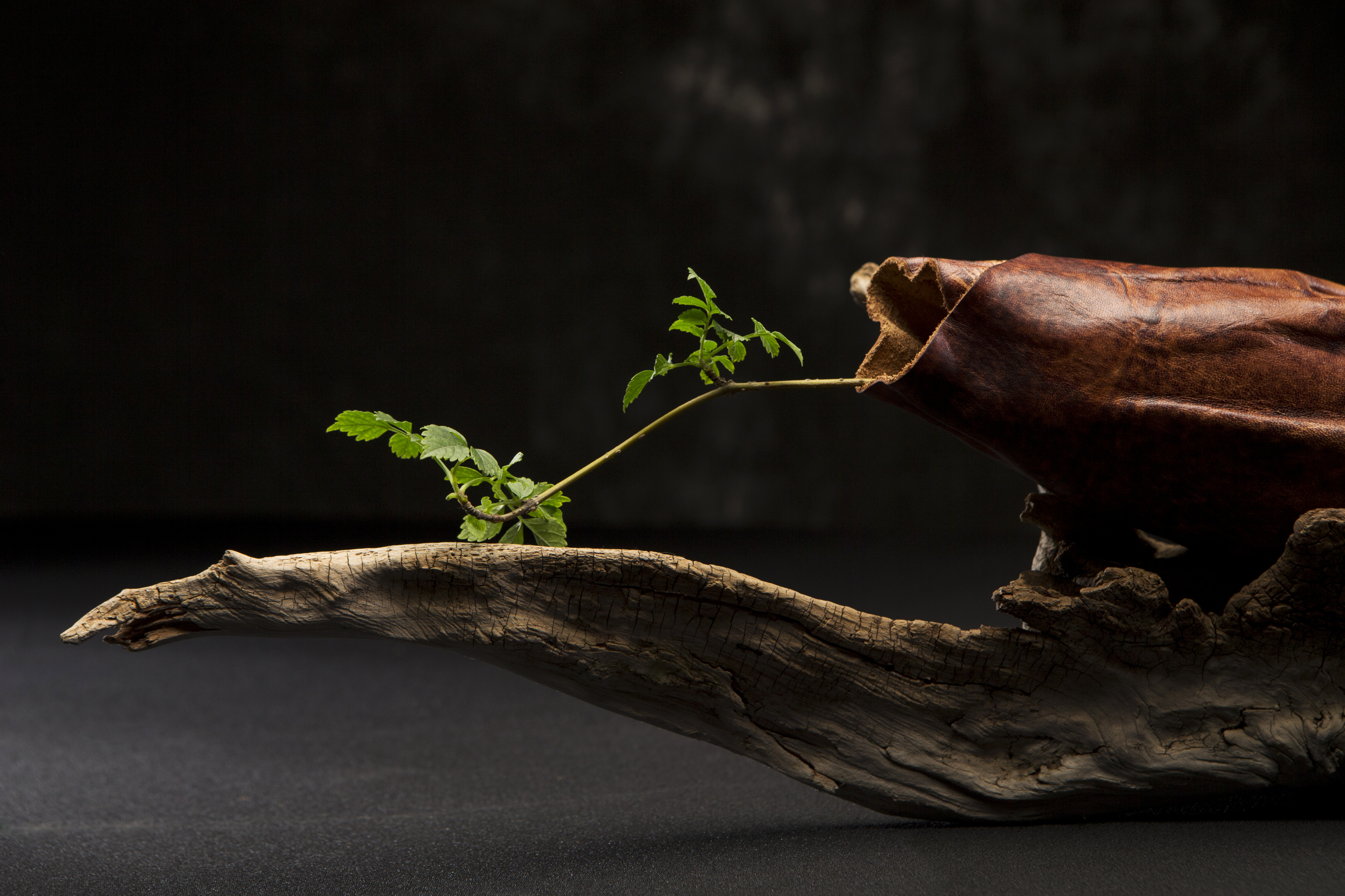 【皮相】系列植鞣革花器为现代中式空间设计,融合植鞣皮革与枯木,展现对自然的崇敬与对材料原始之美的表达,更是对“相”背后深层次意味的探寻与解读。系列运用手工擦色、拓印、缝制与塑形等多种技艺,对材料进行实验与造型思考,力求探索植鞣革花器在现代中式空间中的各种可能性。皮革的温润色泽与枯木的自然纹理交织,宛如一次生命的解锁与重生,绽放出沉静而坚韧的美感。借鉴了一些传统皮囊的造型元素,对花器进行创新延展设计。这一创作过程,既是对传统文化的尊重与传承,也是对现代审美需求的积极回应。作品造型既能单独陈设,又能与花卉相互映衬,营造出一种雅、静的氛围。