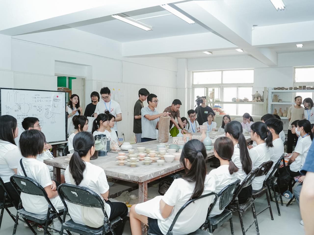 在湖州,他们学习文字的起源与发展,汉字的书写、传播、应用和传承,并亲手创作一幅汉字水墨作品;参观嘉业堂藏书楼、张石铭旧宅、小莲庄等蕴含江南文化深厚底蕴承地方,并将它们用画笔定格在纸上;溯源“两山”文化、寻源湖州历史;聆听非遗传承人的讲述,深入直观地了解湖笔制作项目的工艺流程与技艺特点;体验桑基鱼塘与含山蚕桑养殖等蚕桑文化,综合立体多面地感受中华非物质文化遗产的魅力。在浙江艺术职业学院,通过陶艺体验、漆扇绘制、非遗观摩等,了解学校如何将人才培养、非遗研究和产教融合于一体,让非遗活态传承;在西泠印社,学员们走在百廿名社园林之中,感受传承千年的印文化。