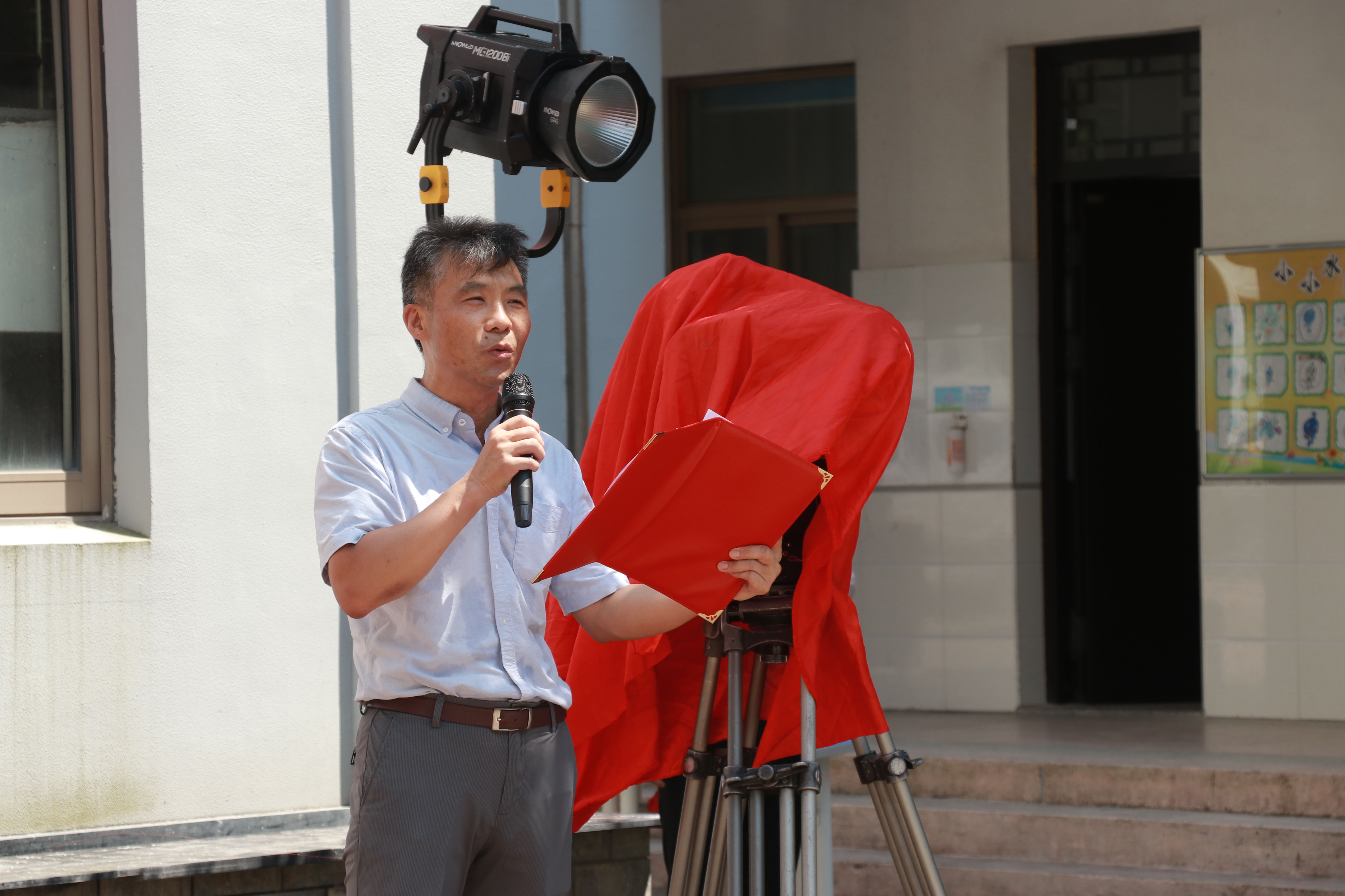 ▲纪委书记沈军甫在影片《我爱我的老师》之《脚尖上的岛屿》篇章开机仪式上致辞
