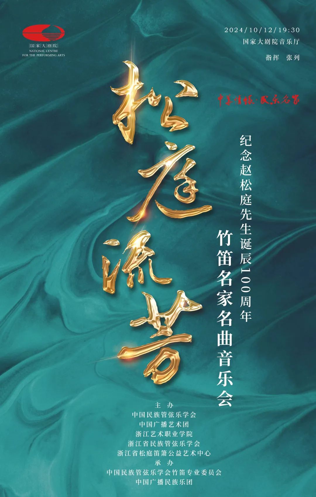 首场活动“松庭流芳——纪念赵松庭先生诞辰100周年竹笛名家名曲音乐会”于10月12日晚在国家大剧院成功举办,此次音乐会特邀著名指挥家张列担任指挥,中国广播民族乐团协奏,多位赵派第一代弟子、国内顶尖竹笛演奏家担任独奏与领奏,协同第二代弟子登台,他们满怀追忆之思,以精湛的笛艺深情演绎,为观众带来一场饕餮乐宴。