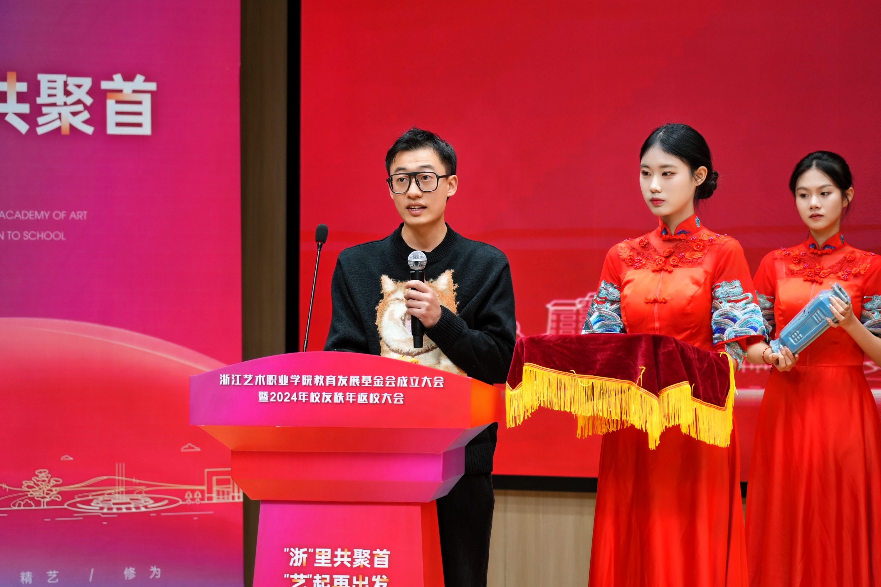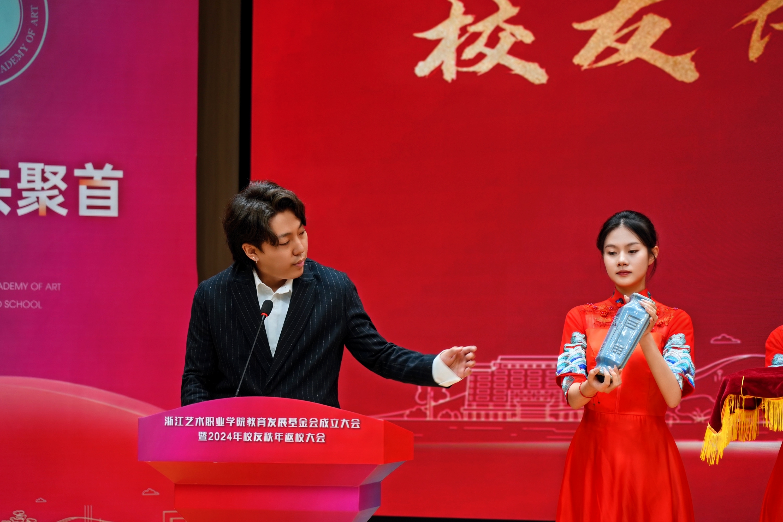 徐天赐、侯淇玮、吴祖康、李昊四位校友代表上台捐赠了珍贵校史史料及文物,并分享了这些物品背后的故事,展现了浙艺深厚文化底蕴和校友们对母校真切的情谊。