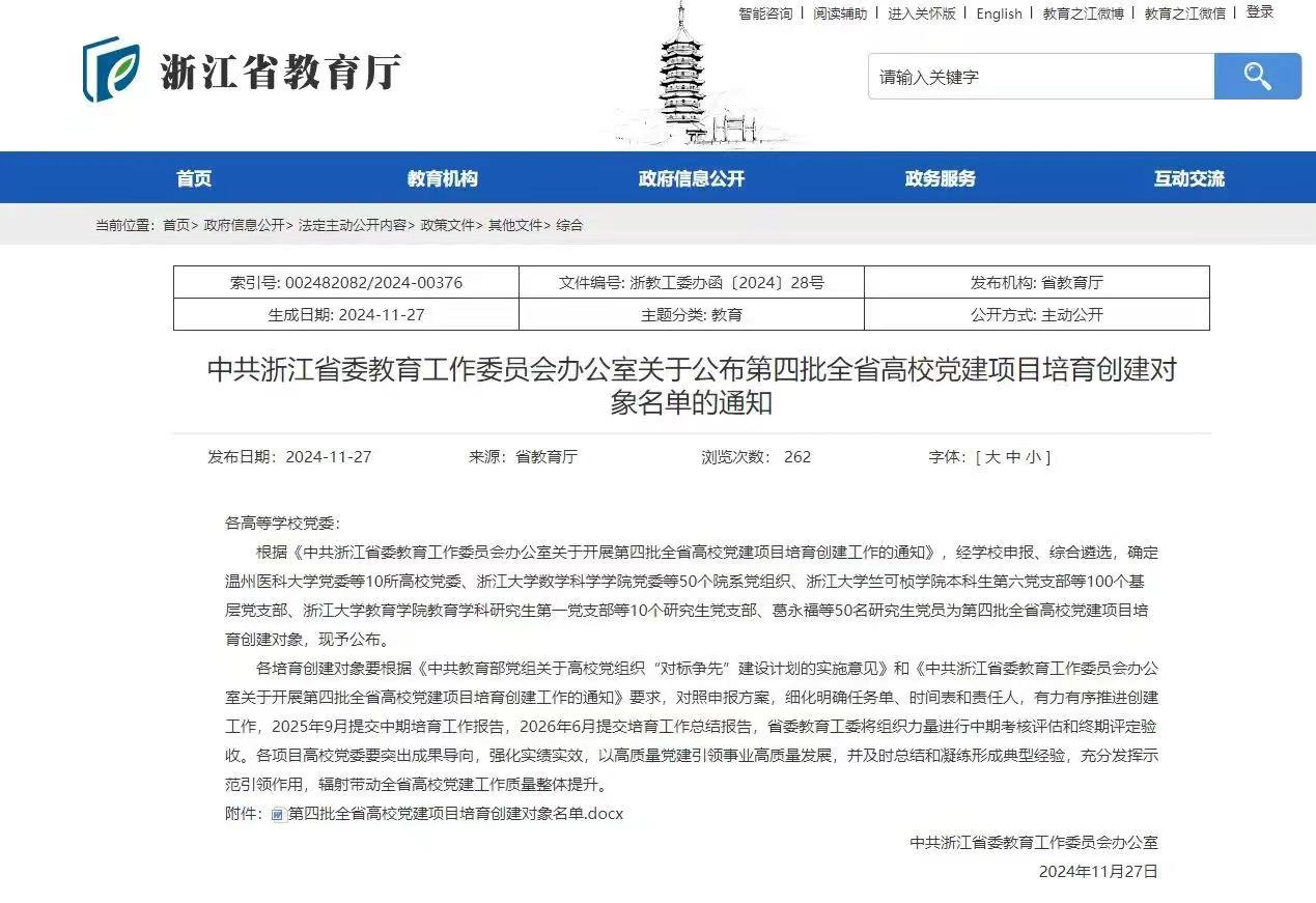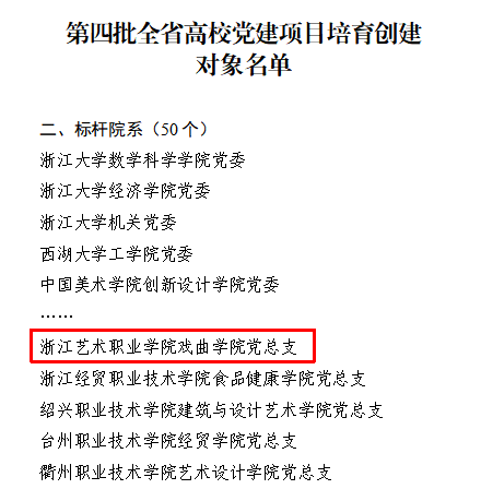 近日,浙江省委教育工委发布通知,公布第四批全省高校党建项目培育创建对象入选名单。经高校申报、综合遴选和公示等环节,最终在全省范围内确定党建示范高校10所、标杆院系50个、样板支部100个、研究生样板党支部10个、研究生党员标兵50名。我校戏曲学院党总支位列其中,成为全省50个(本科院校33个、高职院校17个)“标杆院系”之一。