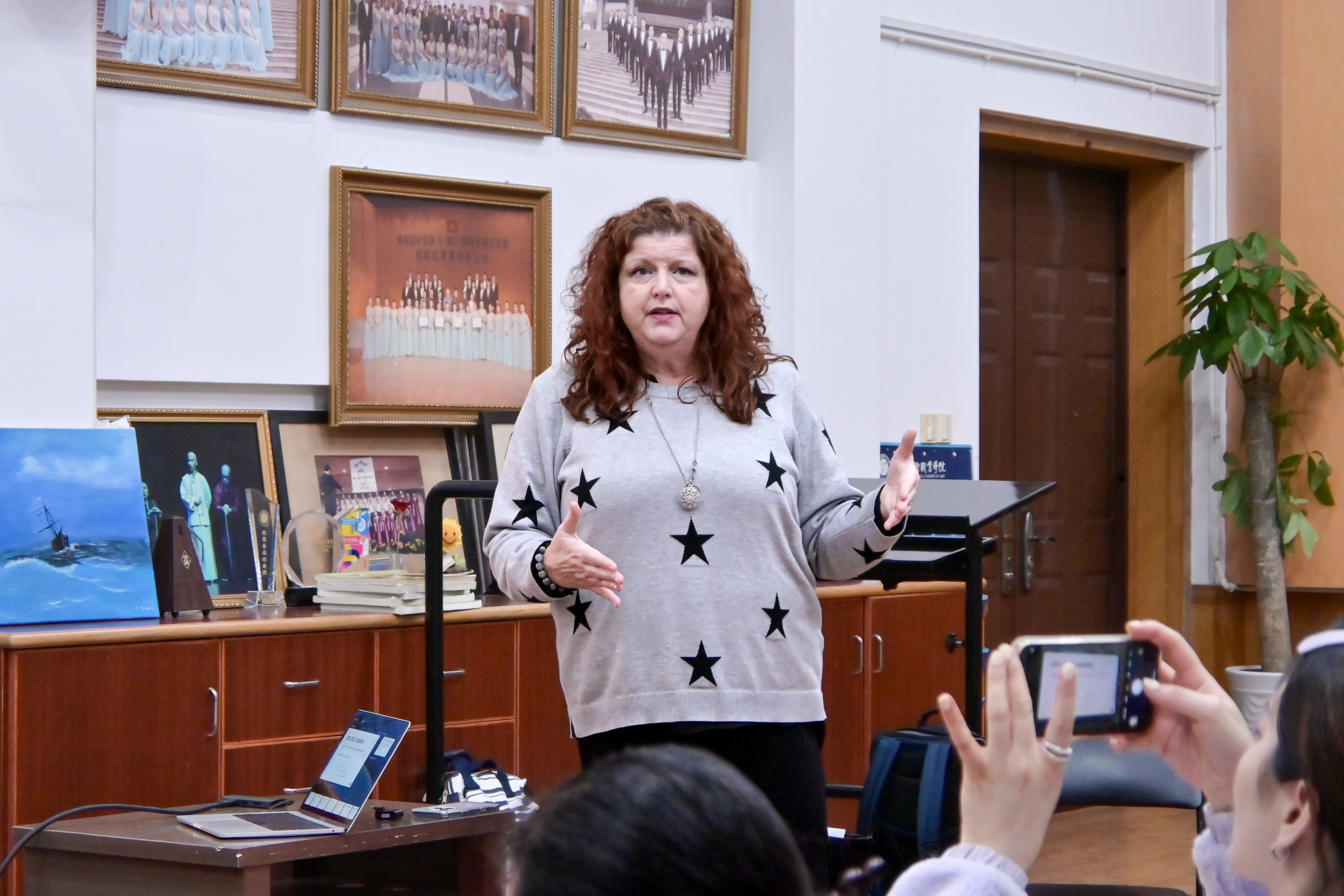 交流期间,科琳·奈斯教授分别在音乐学院合唱教室和音乐厅进行了第五次授课。她声情并茂地讲解、演示,并与现场师生积极互动,充分展现了音乐艺术的独特魅力,激发了大家对音乐更深层次的热爱和理解。科琳·奈斯教授不仅分享了最新的“Estill声音功能性训练”理念,还亲自指导学生如何在表演中融入情感,提升表现力。课堂上,师生们热情高涨,积极参与,整个氛围充满了活力。大家都被科琳·奈斯教授的专业素养和教学热情所感染,收获满满。