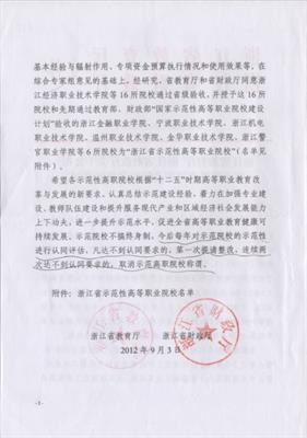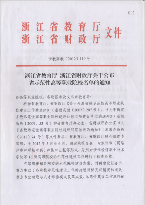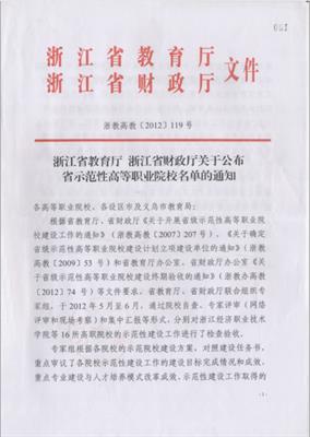 2012年,学校通过检查验收,被授予“浙江省示范性高等职业院校”;群舞《畲家女儿拍》参加第十届全国“桃李杯”舞蹈比赛获群舞一等奖。