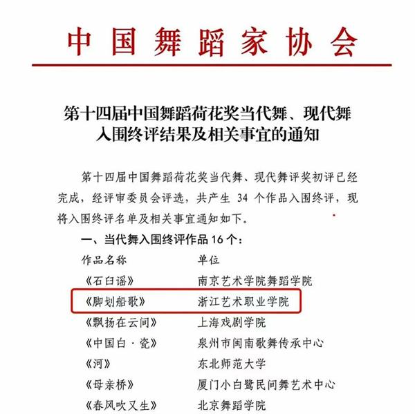 近日,第十四届中国舞蹈“荷花奖”当代舞、现代舞入围终评结果公布,我校舞蹈学院原创男子群舞作品《脚划船歌》成功入围当代舞终评。