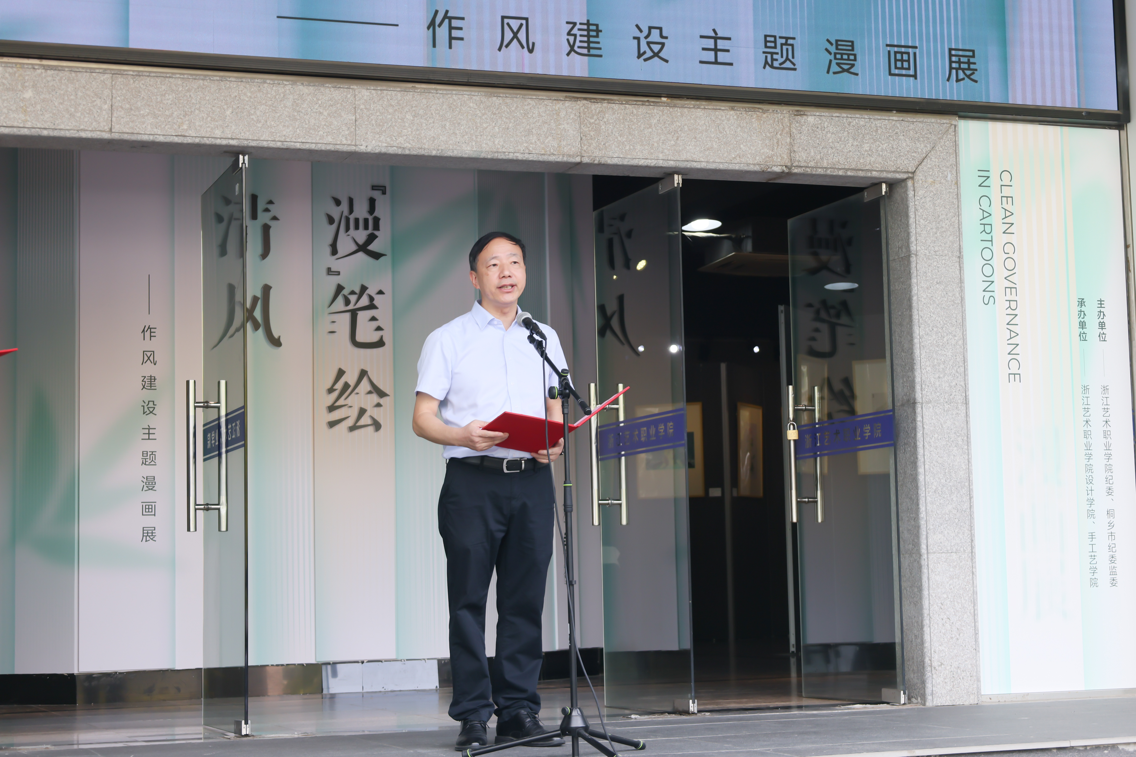 党委副书记夏开堂在致辞中强调,学校近年来持续推进新时代清廉校园建设,师生廉洁文化作品屡获佳绩,充分展现了学校廉洁教育的深厚积淀。此次与桐乡市纪委监委合作举办漫画展,是深化落实中央八项规定精神、加强作风建设的重要实践。他希望全校党员干部和教职工进一步坚定理想信念,坚守廉洁从教,争做担当作为的表率,共同为推动学校新一轮高质量发展贡献力量。