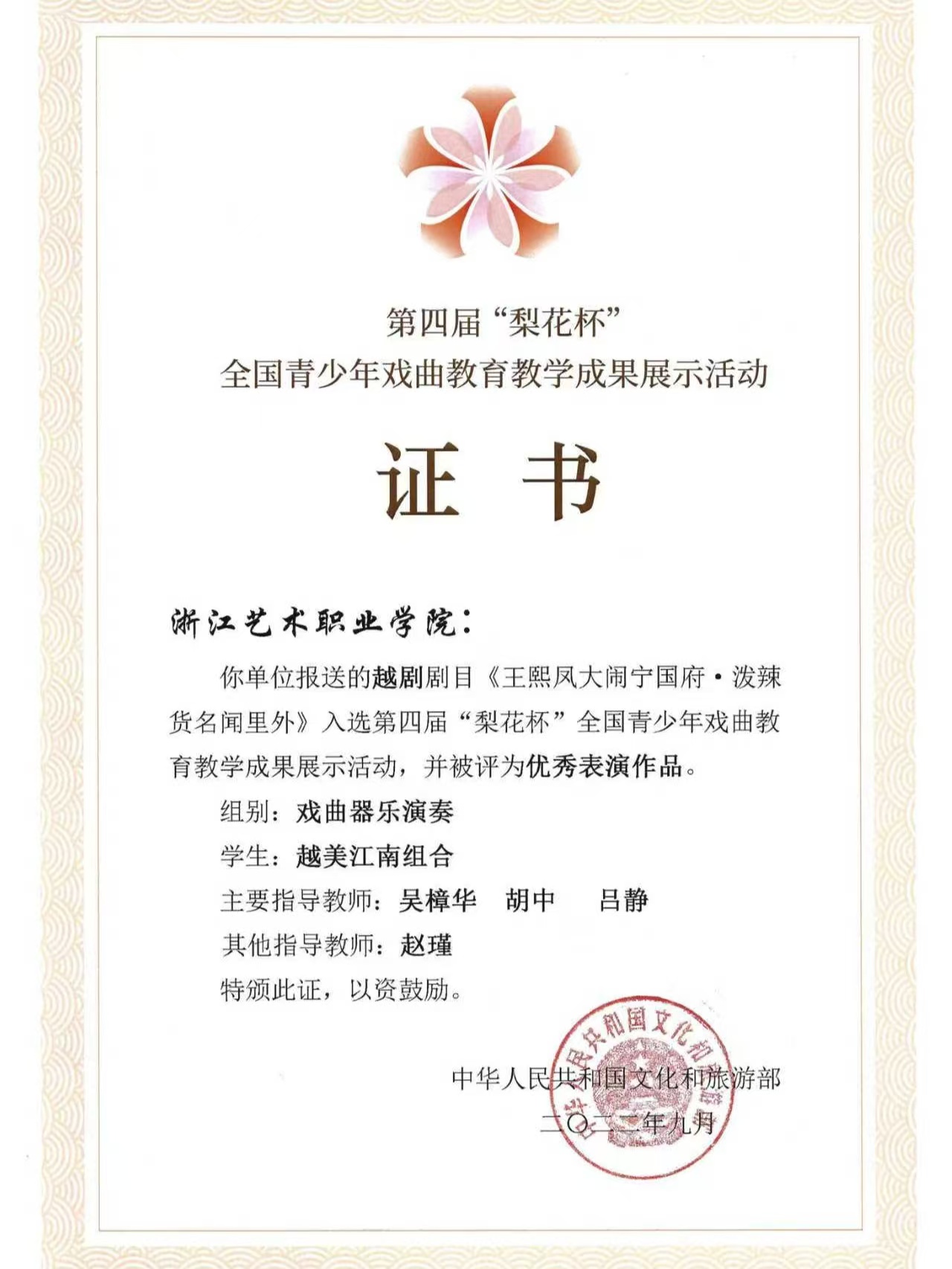 师生参与农村文化礼堂、送教下乡活动两次得到省委领导批示;连续7年、2000余人次参与国家级非遗“楼塔细十番”保护志愿服务;师生积极参与浙江省属院团新春展演季、杭州亚(残)运会开闭幕式演出、浙江省建党100周年文艺演出、G20峰会《最忆是杭州》演出、全国学运会开幕式演出等重大活动,先后获省级志愿服务“十佳项目”“优秀团队”“最美志愿者”“优秀组织工作者”等称号,在浙江高水平文化强省建设中扮演了服务标兵的角色。