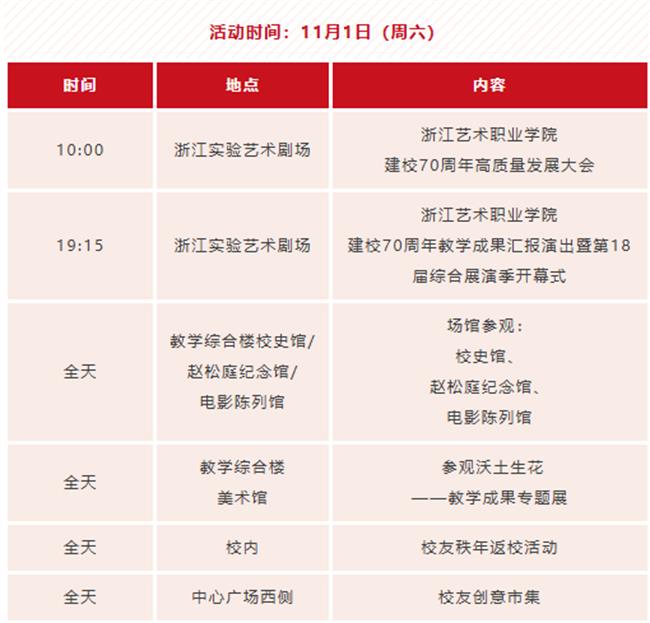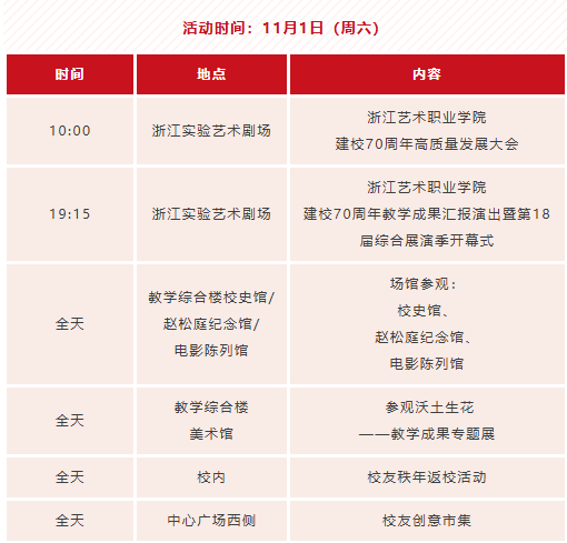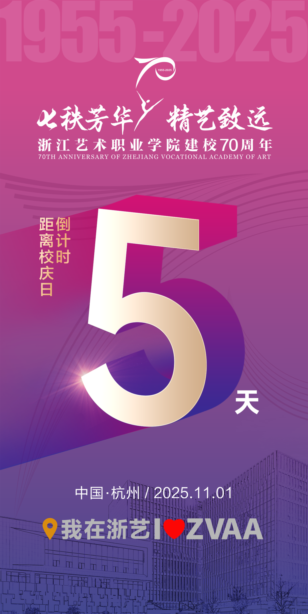 七秩芳华,精艺致远。回溯七十载风雨兼程,学校始终扎根沃土,秉承初心,以艺育人,硕果盈枝。七秩华诞,不仅是对过往辉煌成就的深情礼赞,更是迈向高质量发展征程的崭新起点。学校定于2025111日隆重举行建校70周年高质量发展大会,并将在校庆期间精心组织系列活动(具体详见附件)。我们诚挚邀约四海校友重返母校,漫步熟悉校园,重温学艺时光,再续同窗情谊;热切期盼全体师生员工、离退休老同志欢聚一堂,共享荣光,同庆盛典;由衷欢迎关心学校发展的各界朋拨冗莅临,相聚浙艺,共同见证这承载七秩荣耀与梦想的重要时刻,共贺华诞、同襄盛举!