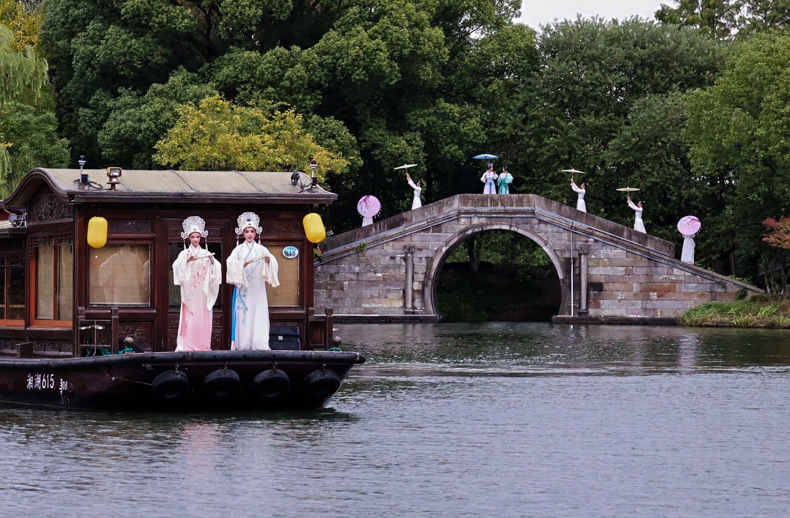 演出中,我校师生充分展现出扎实的专业素养与灵活的应变能力:博物馆内的近距离表演,精准把控肢体细节以传递细腻情感;摇橹船上的动态呈现,克服环境干扰保持动作协调统一;廊桥、草坪等开放空间的演出,巧妙利用自然音效与光影,让舞蹈与湘湖山水融为一体。师生们的精彩表现,赢得现场观众与业内嘉宾的一致好评,成为湘湖山水间一道亮眼的 “艺术风景线”。