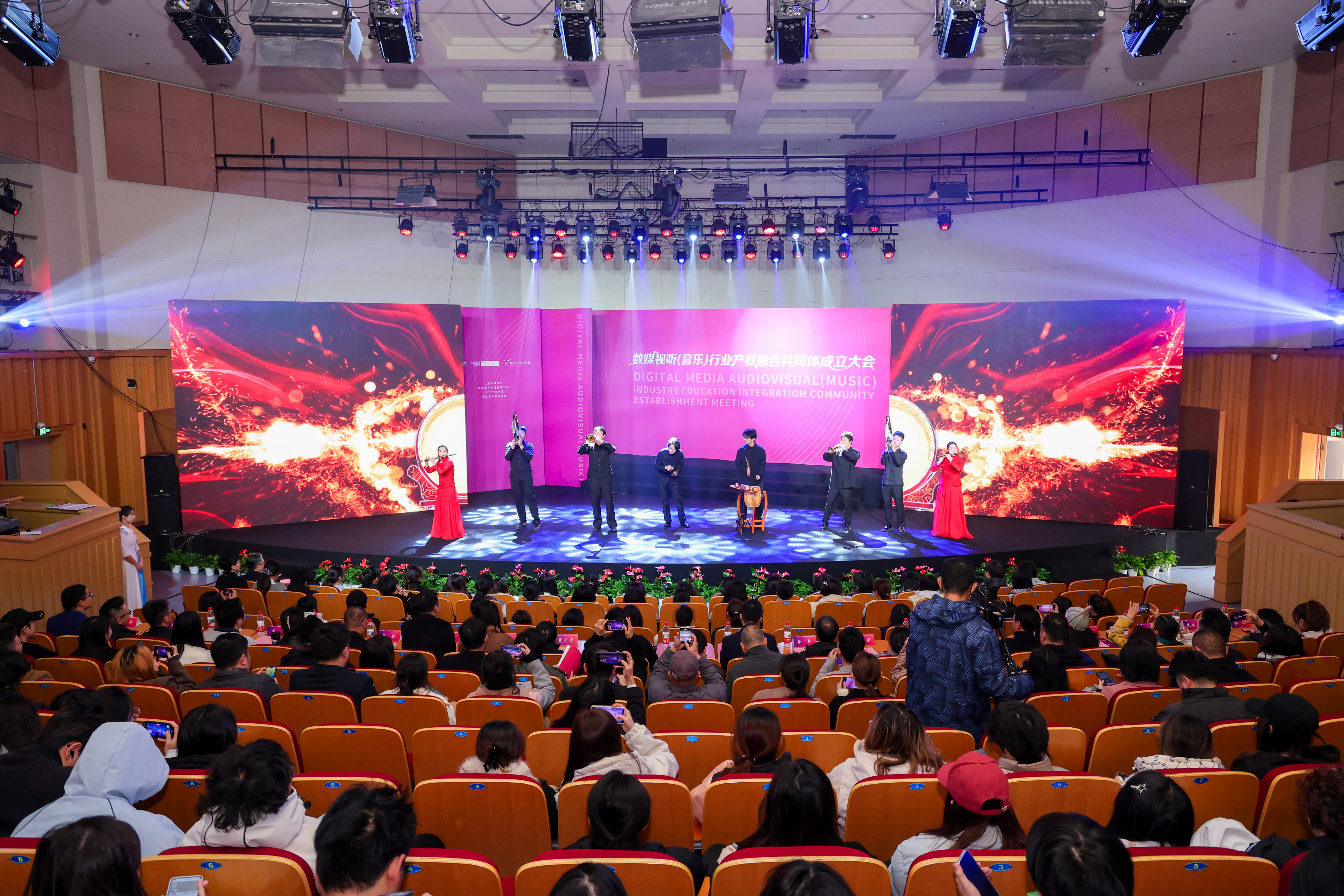 薛亮指出,共同体的成立是贯彻落实党的二十大关于文化数字化战略部署的生动实践,也是服务浙江“高水平文化强省”建设的关键举措。他强调,数媒视听行业正经历技术革新与产业变革,亟需构建“教育链—人才链—产业链—创新链”深度融合的新生态。为此,共同体将以“共建、共育、共享、共赢”为原则,重点推进四项举措。一是资源整合:共建虚拟现实音乐剧场、AI音乐创作实验室、沉浸式文旅音效实训中心等平台,推动教学场景与产业需求无缝对接;二是标准共建:协同行业龙头企业研制数媒音乐岗位能力标准,开发“岗课赛证”融通课程体系;三是人才共育:推行现代学徒制和项目化教学,让学生深度参与数字专辑制作、非遗数字化传播等实战项目;四是生态营造:定期发布《数媒视听人才发展报告》,举办行业论坛与成果展,助力文化出海。